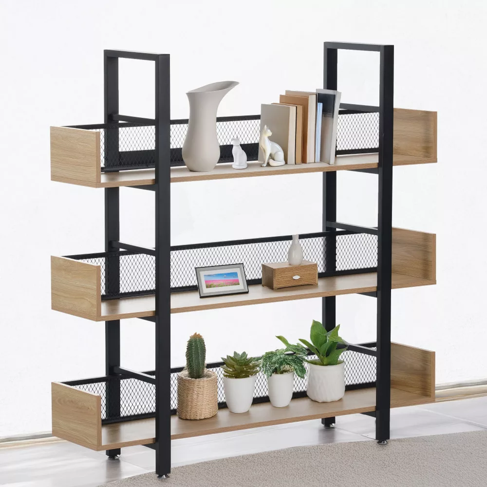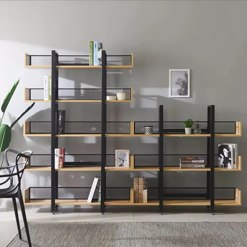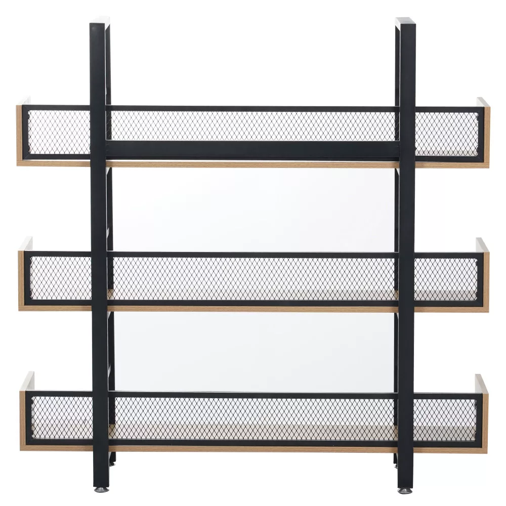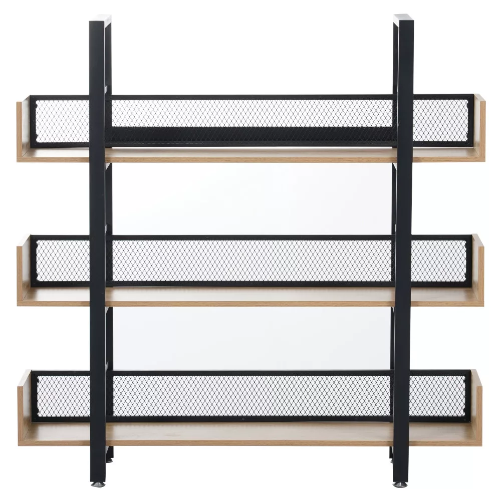 A polc modern esztétikáját a fekete fém váz és a meleg, tölgy hatású MDF polcok kontrasztja határozza meg. Ez a harmonikus párosítás természetes benyomást kelt, így könnyedén beilleszthető szinte bármilyen enteriőrbe, legyen szó nappaliról, dolgozószobáról vagy akár egy hangulatos kávézó belső teréről. A szerkezetet hátulról egy ízléses, fekete fémháló szegélyezi, ami nem csupán esztétikai elem, de a stabilitást is növeli. A tervezés során a praktikumra is nagy hangsúlyt fektettünk: a szerkezet állítható lábakkal végződik, amelyek hatékonyan kiegyenlítik a padló esetleges egyenletlenségeit, biztosítva a stabil tartást.