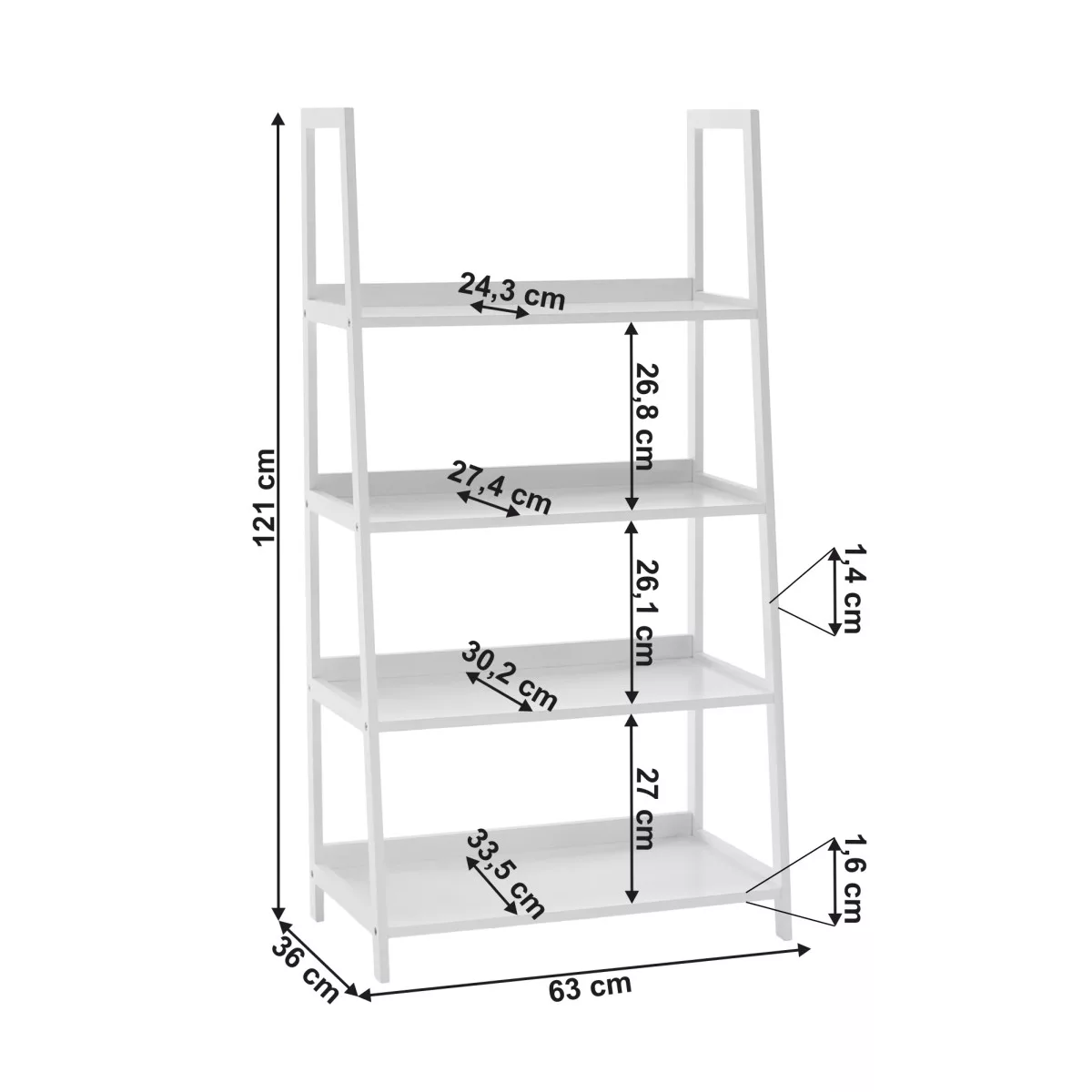 Ez a **polcrendszer** nem csupán egy tárolóbútor, hanem egy designelem, amely lehetőséget ad a személyes tárgyaid, könyveid vagy növényeid stílusos bemutatására. A gondos tervezés minden apró részletben megmutatkozik. A bútordarab teljes mérete 63x36x121 cm (Szélesség x Mélység x Magasság), így anélkül biztosít bőséges tárolóhelyet, hogy uralná a teret. A szerkezet stabilitását a 1,4 cm vastagságú állványelemek és a 1,6 cm vastagságú polclapok garantálják, melyek egyenként 5 kg teherbírással rendelkeznek.