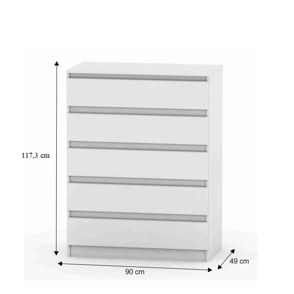 Ismerd meg a HANY NEW 005 komódot, amely a tökéletes megoldást kínálja a tárolási dilemmákra. Ez a letisztult, fehér színben pompázó tároló szekrény öt tágas fiókkal rendelkezik, így ideális választás lehet ruhás komódnak a hálószobába, vagy dokumentumok és egyéb értékek diszkrét elhelyezésére a dolgozó- vagy nappali szobában. A 16 mm vastagságú, minőségi laminált faforgácslapból készült bútortestet ABS élek védik a sérülésektől, garantálva a hosszú élettartamot és az időtálló megjelenést. A részletgazdag, precíz kidolgozás révén ez a bútor nem csupán praktikus, hanem esztétikus kiegészítője is lesz otthonodnak.