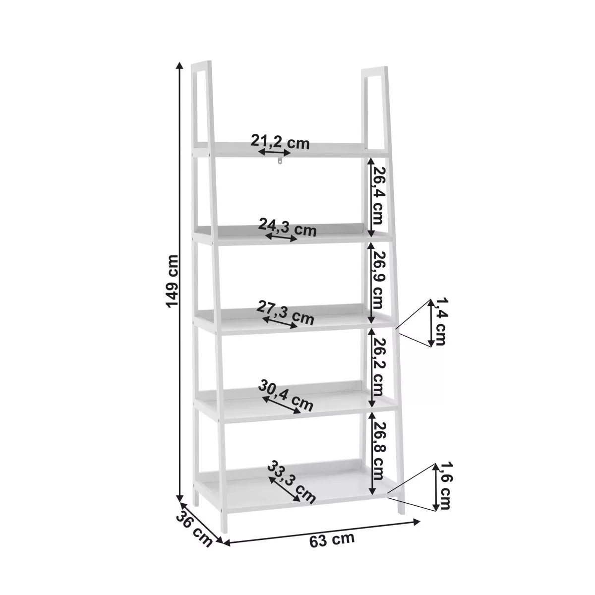 A bútordarabot a részletekre való odafigyelés jellemzi. A teljes mérete (Szélesség x Mélység x Magasság): 63x36x149 cm, így optimális helykihasználást biztosít anélkül, hogy túlzsúfolná a teret. A szerkezet stabilitását a 1,4 cm vastagságú állványelemek, míg a polcokét a 1,6 cm vastagságú lapok garantálják. Minden egyes polc teherbírása 5 kg, így biztonsággal helyezheted el rajta kedvenc könyveidet, növényeidet vagy dísztárgyaidat.