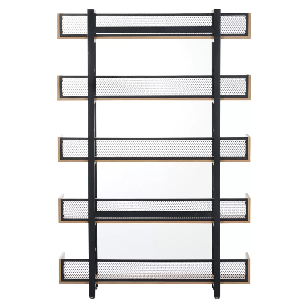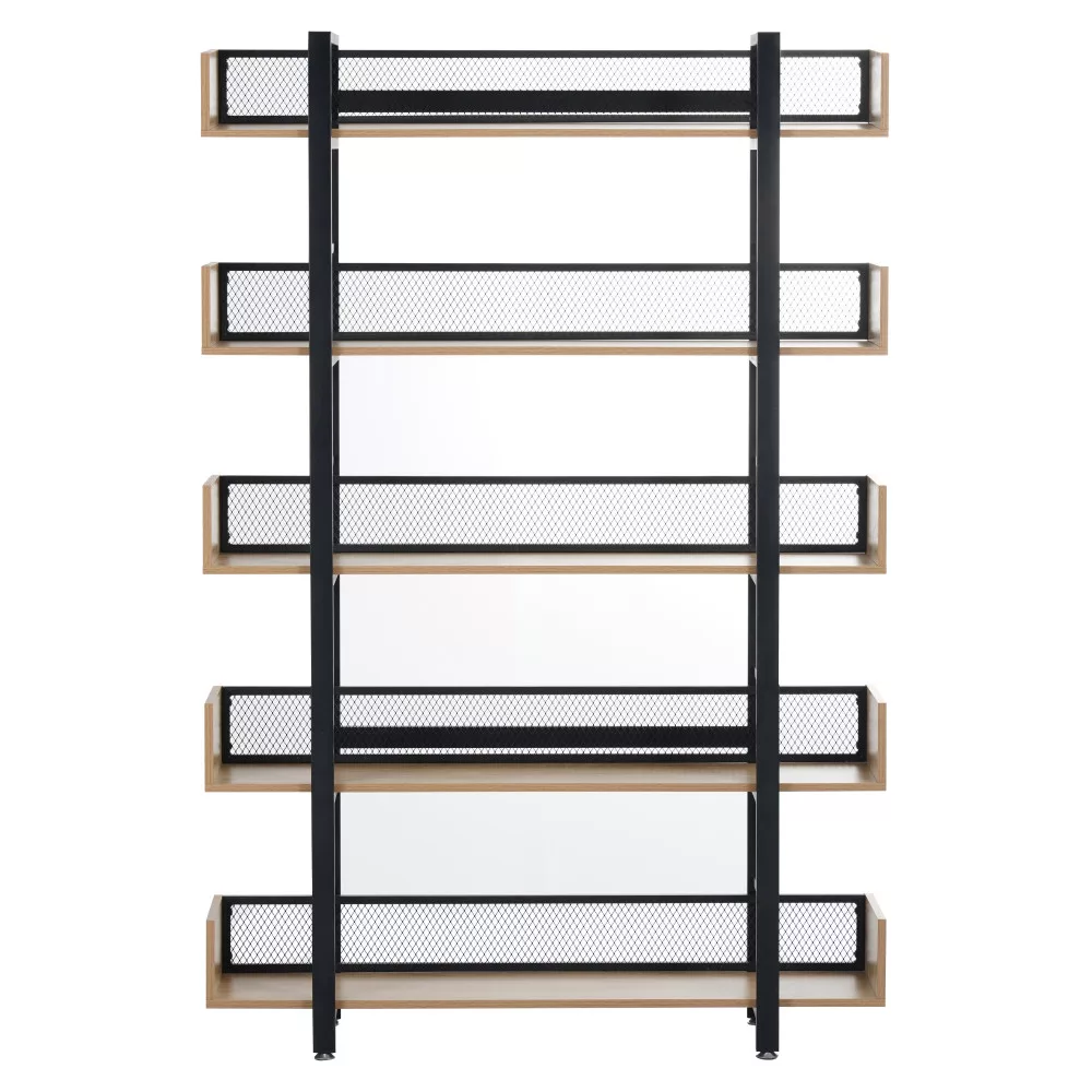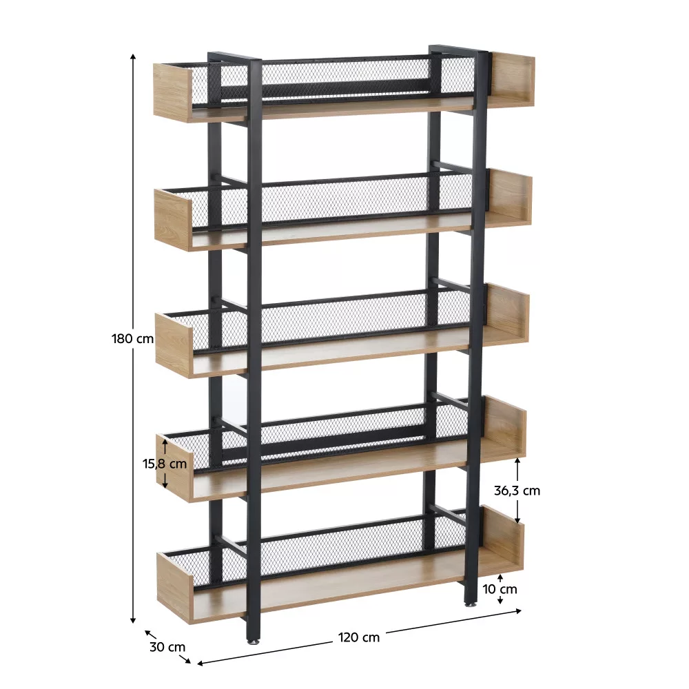 A KILIS NEW TYP 2 egy olyan sokoldalú polcrendszer, amelynek masszív, fekete fém szerkezete és a meleg tónusú, tölgy kivitelű laminált MDF polcai közötti kontraszt azonnal megragadja a tekintetet. Az öt tágas polc bőséges helyet kínál könyveid, növényeid vagy legkedvesebb dekorációid számára, míg a hátoldalon végigfutó fekete fémháló nemcsak megerősíti a szerkezetet, hanem egyedi vizuális elemet is kölcsönöz a bútornak. Ez a megoldás ideális választás lehet akár egy hangulatos kávézó vagy egy tematikus étterem belső terének kialakításához is.