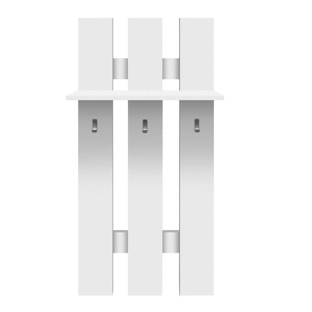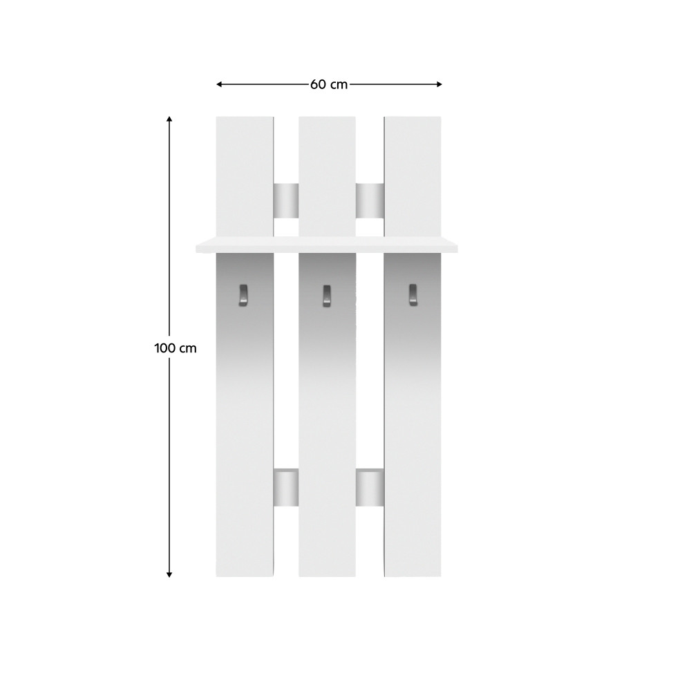 Ez az **előszoba fogas** a praktikusságot helyezi előtérbe. A **három akasztó** elegendő helyet biztosít a kabátoknak, táskáknak és sálaknak, míg a felső polc ideális kalapok, kesztyűk vagy dekorációs tárgyak tárolására. Letisztult kialakítása révén szinte észrevétlenül simul bele a falba, mégis hatékonyan látja el feladatát.
