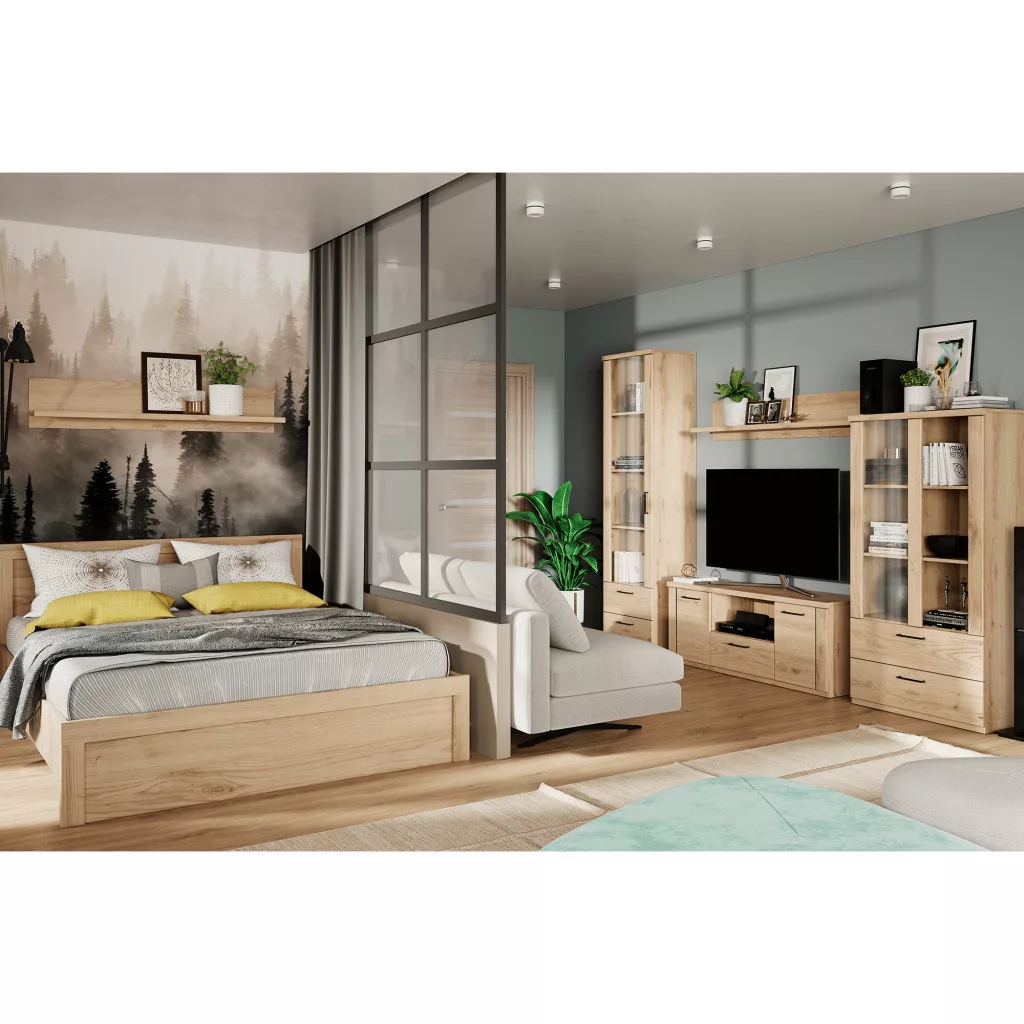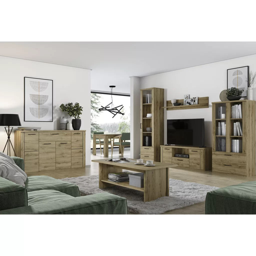 A DORSI kollekciót a részletekre való odafigyelés jellemzi. A meleg fa hatású felületet modern kontrasztként egészítik ki a letisztult vonalvezetésű, fekete műanyag fogantyúk, amelyek kényelmes használatot biztosítanak. Az üvegezett ajtók mögött elegánsan helyezheted el kedvenc dísztárgyaidat, értékes porcelánjaidat vagy egyedi pohárkészletedet, így ez a bútor egyszerre funkcionálhat mint kiállító szekrény, pohárszék vagy akár klasszikus porcelán szekrény is. A kombinált kialakítás – amely nyitott polcokat, üveges ajtókat és két tágas fiókot is magában foglal – rendkívül sokoldalú tárolási lehetőségeket kínál.