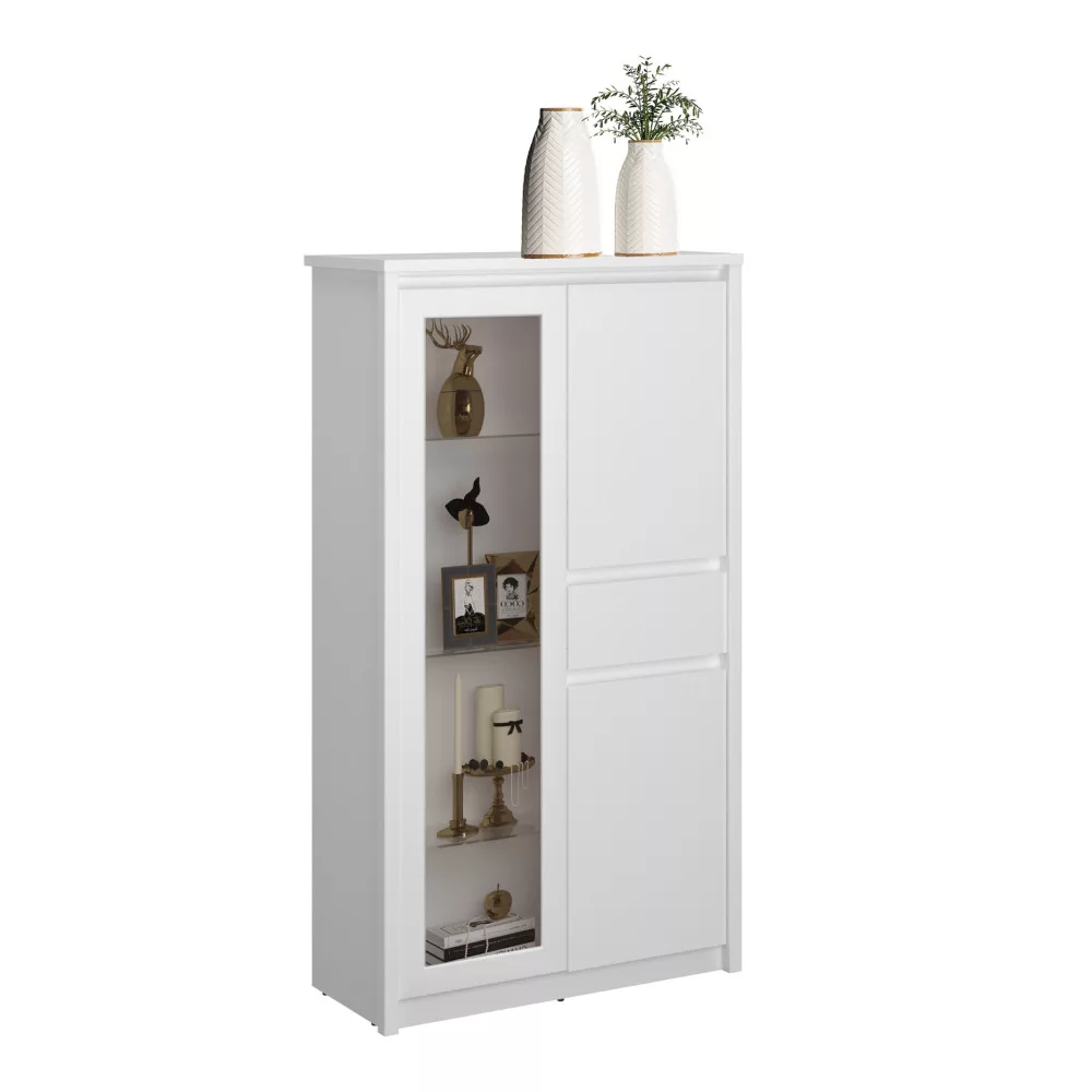 Ez a sokoldalú modell egyszerre funkcionálhat elegáns pohárszékként, praktikus tálalóként vagy akár porcelán szekrényként is, ahol legszebb tárgyaidat helyezheted el. A bútort üveges ajtókkal terveztük, amelyek mögött üveges polcok találhatók. Ezek teherbírása 3 kg, így ideálisak dísztárgyak vagy poharak bemutatására. A bútordarab alsó részén egy praktikus, 17 cm magas fiók is helyet kapott, amely tökéletes az apróbb kiegészítők diszkrét tárolására. A zárt, szekrény ajtókkal ellátott részekben tömör polcok biztosítanak stabil tárolófelületet, egyenként 5 kg-os teherbírással, így nehezebb tárgyak elhelyezésére is alkalmasak.