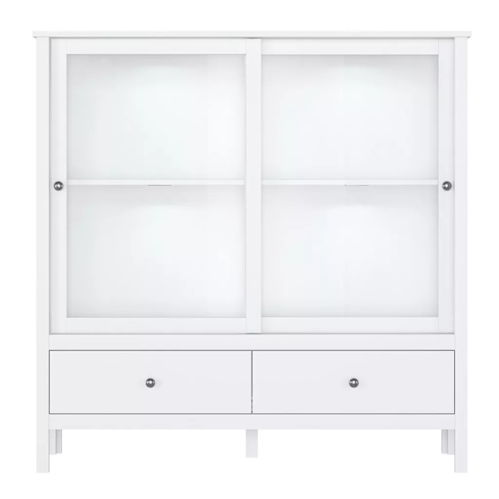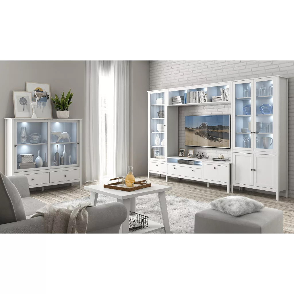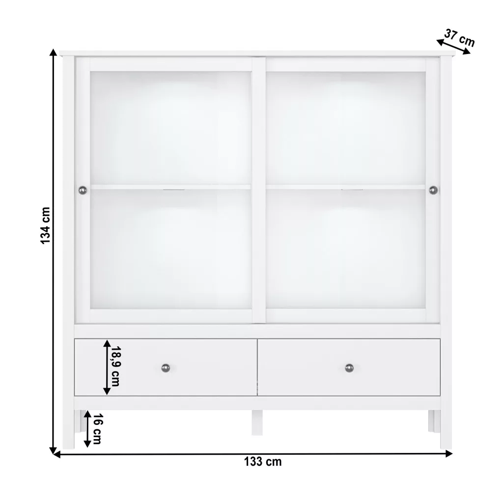 - Kialakítás: Kombinált vitrin, amely két üveges ajtóval és két tágas fiókkal rendelkezik, így zárt és nyitott tárolási lehetőséget is kínál.