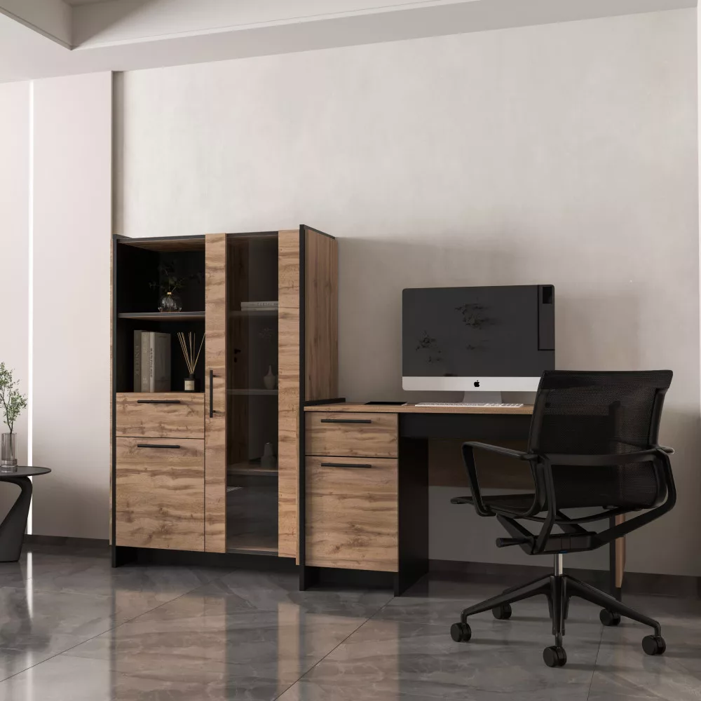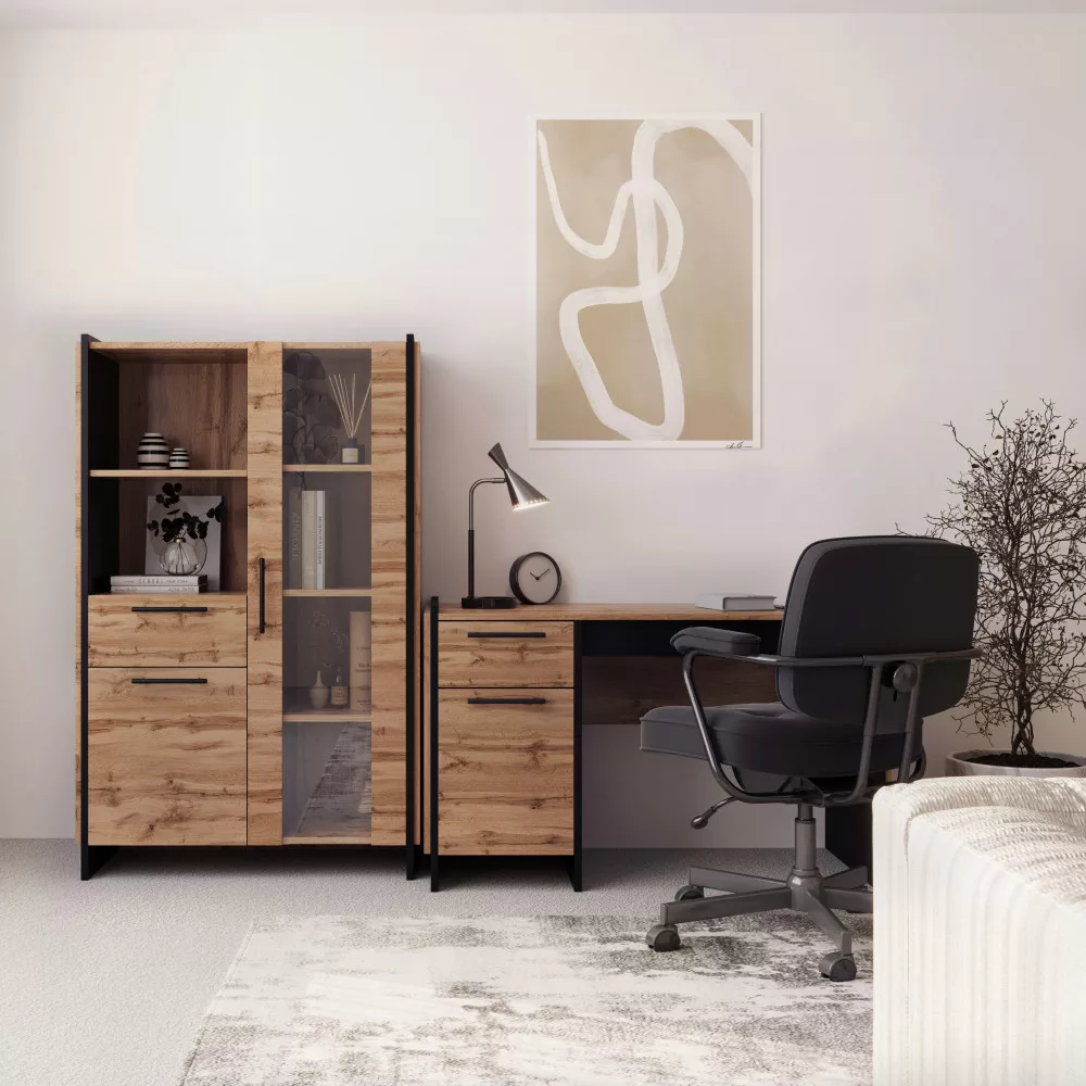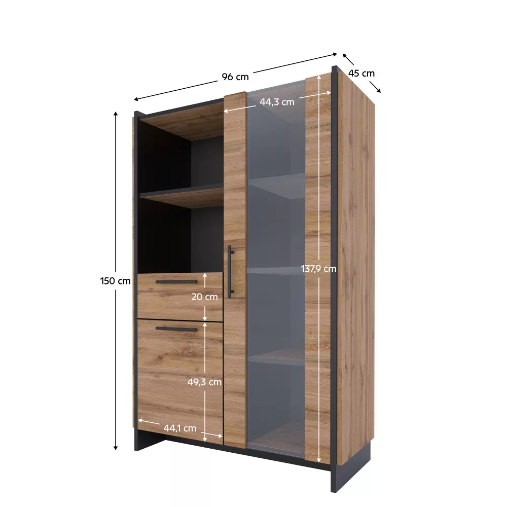 A bútor karakterét a természetes hatású dekor és a mélyfekete elemek kontrasztja adja, amelyet a letisztult, fekete fém fogantyúk tesznek teljessé. A minőségről és a tartósságról a különleges, dupla laminált DTD bútortest és az éleket védő ABS élek gondoskodnak, amelyek hatékonyan ellenállnak a mindennapi használat során keletkező karcolásoknak és mechanikai sérüléseknek. Ez a bútordarab tökéletesen funkcionálhat mint pohárszék az étkezőben, vagy elegáns porcelán szekrény a nappaliban, ahol az üveges ajtók mögött stílusosan mutathatod be legszebb dísztárgyaidat vagy étkészletedet.