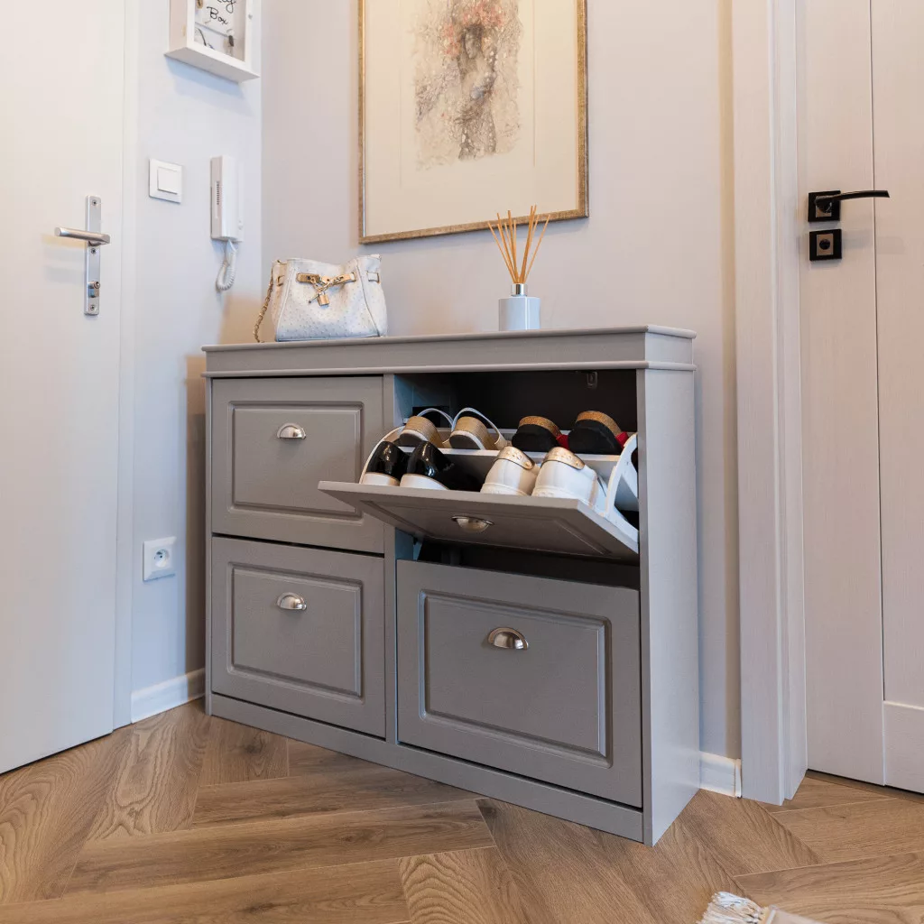 A rendezett előszoba az otthon harmóniájának első lépése, ahol a szétszórt cipők könnyen megtörhetik a gondosan kialakított összhangot. Szeretnénk bemutatni egy olyan megoldást, amely eleganciát és funkcionalitást ötvöz: a SEBER TYP 5 billenőfiókos cipősszekrényt. Ez a bútordarab MDF és forgácslap kombinációjából készült, időtálló szürke színben, amely diszkréten illeszkedik a legtöbb enteriőrbe.