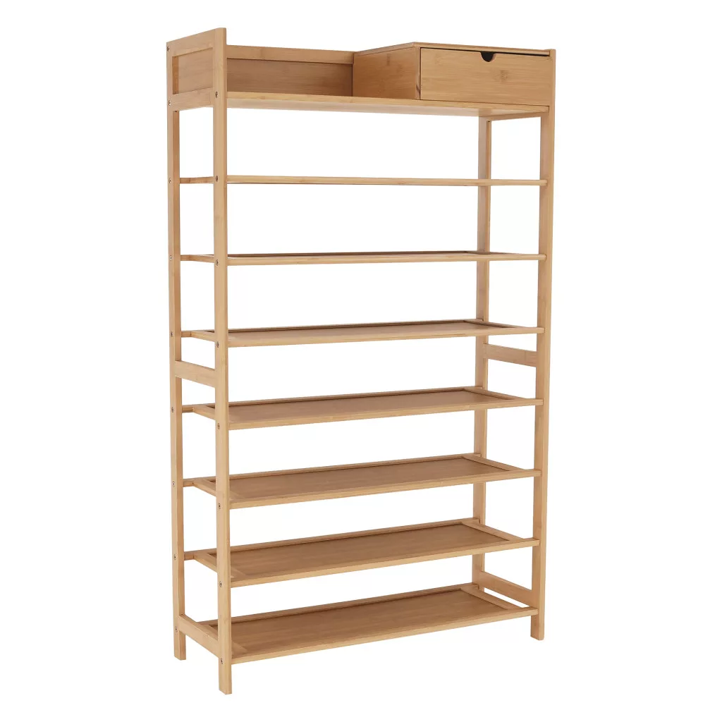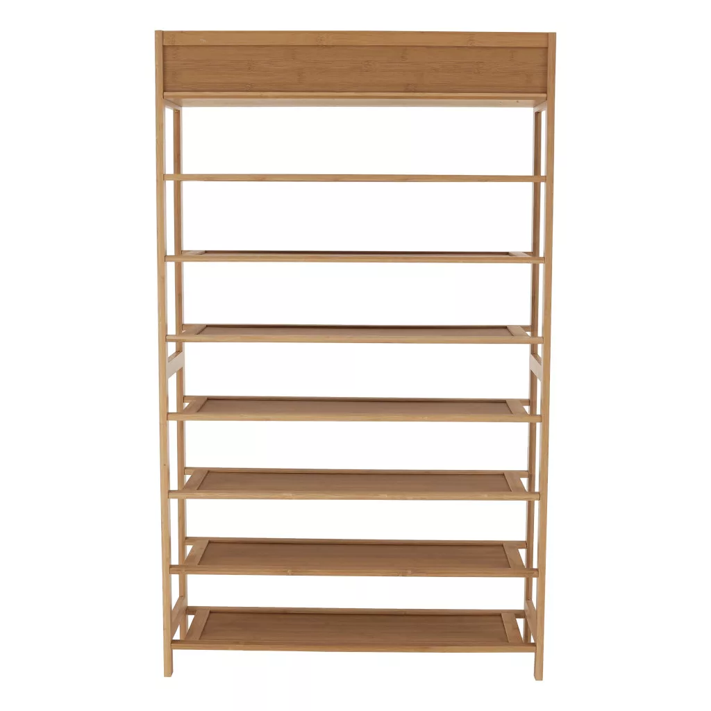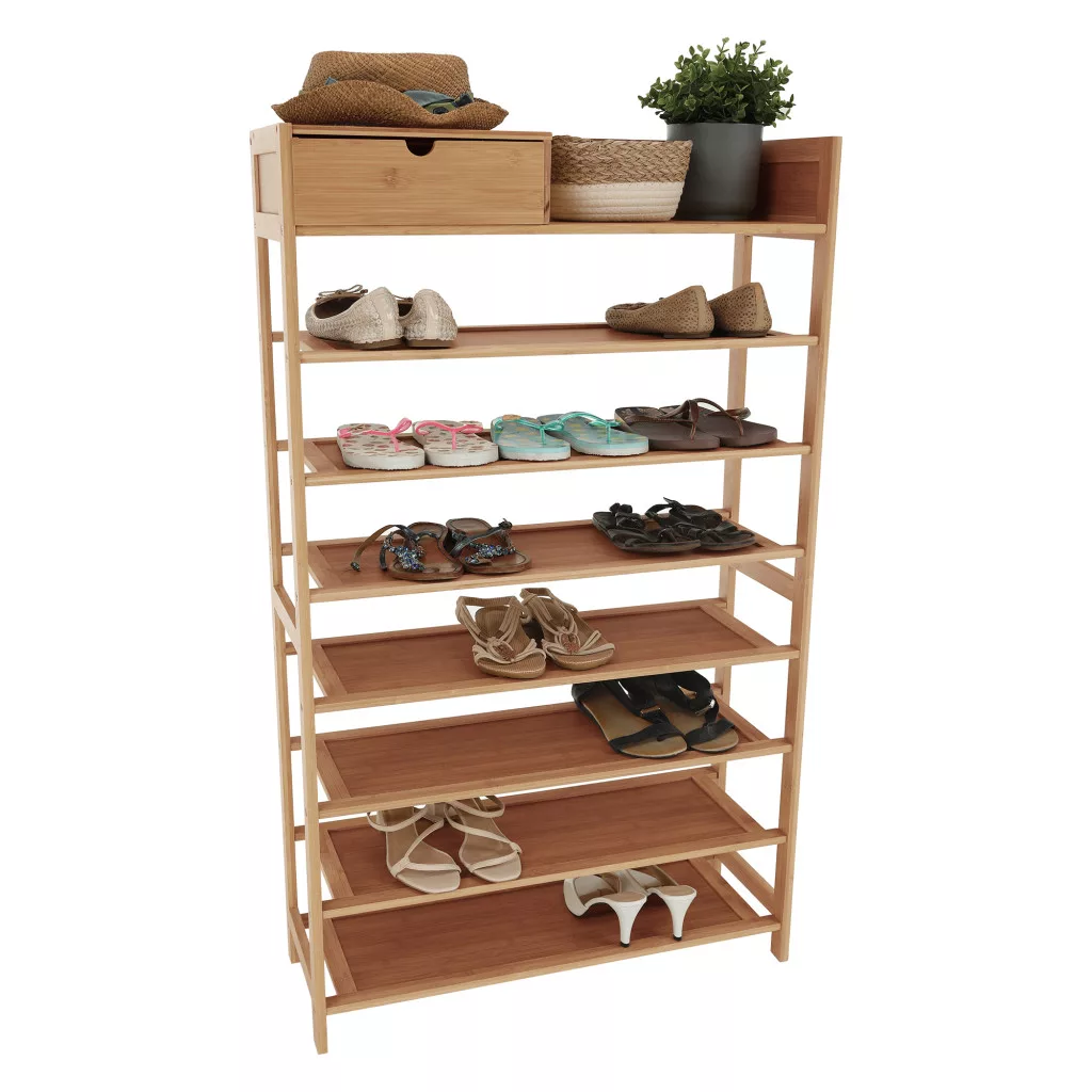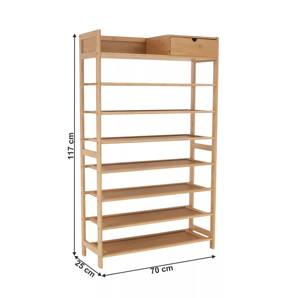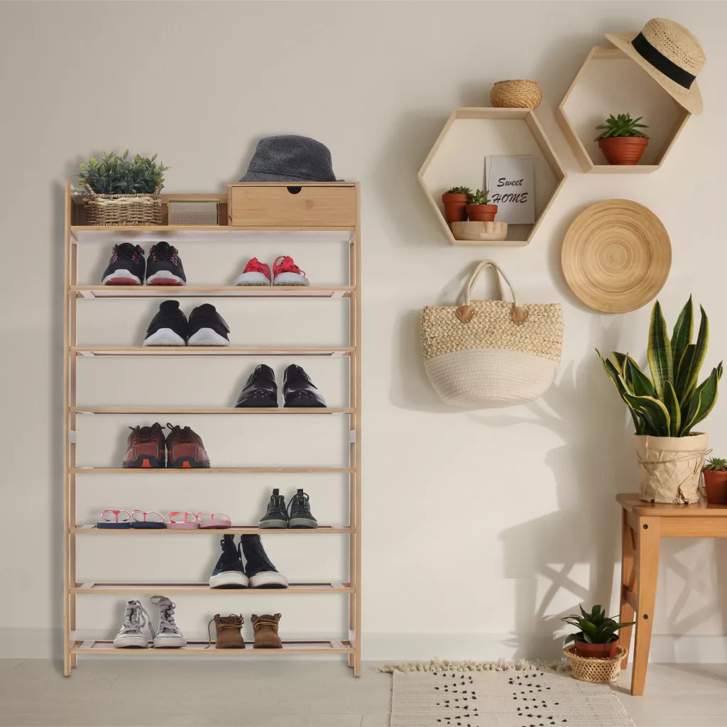 A rendezett és hívogató előszoba megteremtése gyakran nagyobb kihívás, mint gondolnánk. A KATLEY cipőspolc egy olyan praktikus és esztétikus megoldást kínál, amely véget vet a szétszórt cipők látványának. A hét soros polcállvány lakkozott bambuszból készült, természetes megjelenésével pedig harmonikusan illeszkedik bármilyen otthonba, míg a beépített fiók extra tárolási lehetőséget nyújt.