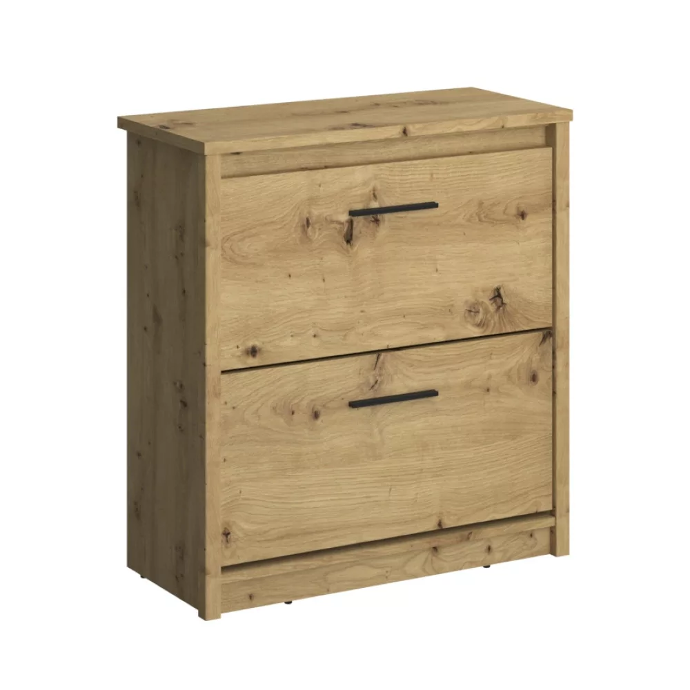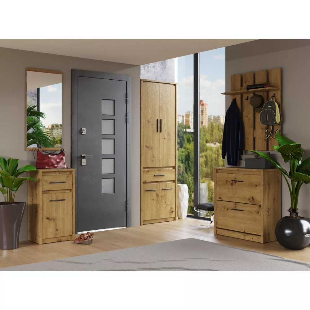 A modern AIRON bútorkészletet úgy terveztük, hogy ne csak esztétikailag, hanem funkcionálisan is megfeleljen a kor elvárásainak. A letisztult vonalvezetést a fekete színű, diszkrét műanyag fogantyúk egészítik ki, finom kontrasztot alkotva a fa természetes mintázatával. A szekrény praktikus, két billenős fiókkal rendelkezik, amelyek bőséges helyet kínálnak lábbelijeid rendezett tárolására, megóvva őket a portól és a szem elől. A stabil tartásról masszív műanyag lábak gondoskodnak.