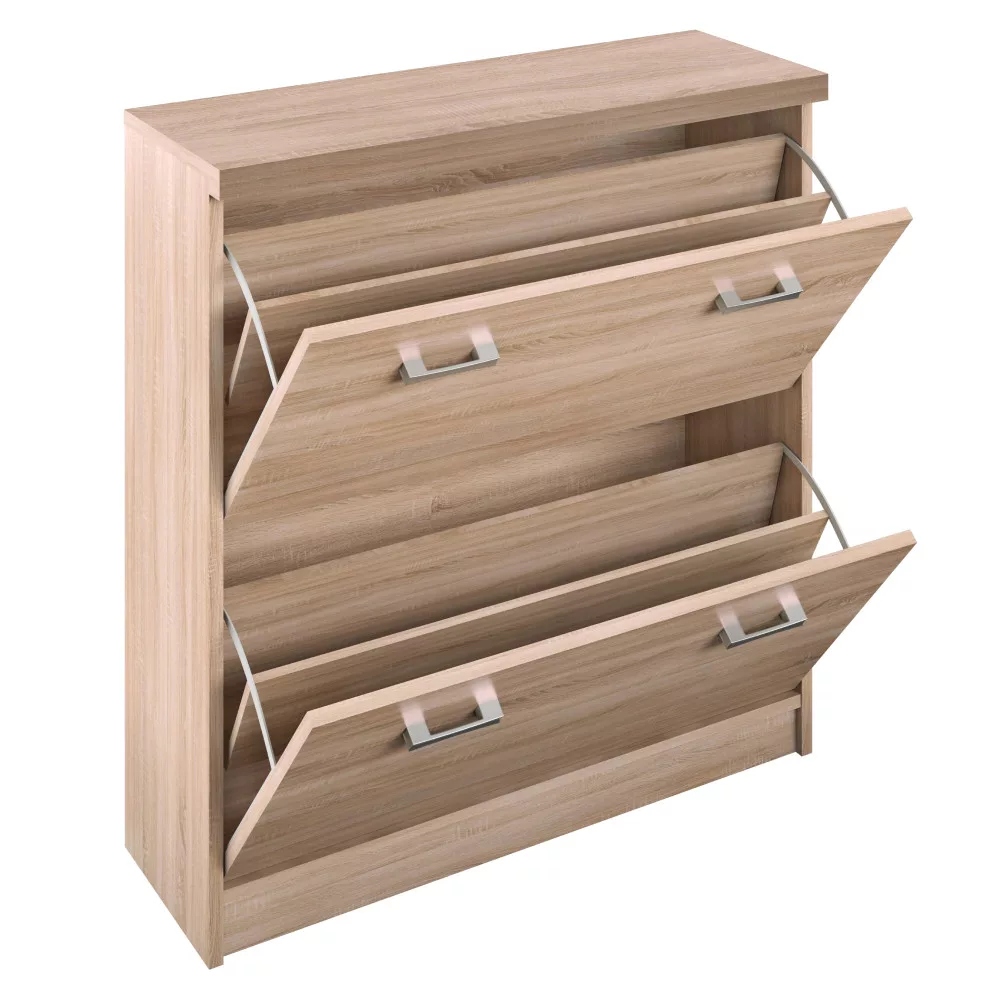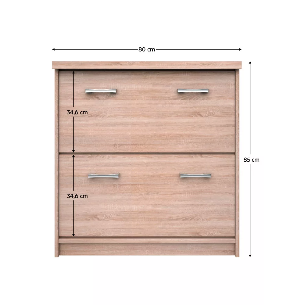 A két tágas, billenős fiók diszkréten rejti el a lábbeliket, így a látvány mindig rendezett és esztétikus marad. Kompakt, mindössze 27 cm-es mélységének köszönhetően ez a cipőtartó keskeny folyosókon vagy kisebb előterekben is ideális választás, anélkül, hogy elvenné a teret a közlekedéstől. Az egyszerűség és a funkcionalitás tökéletes egyensúlya teszi ezt a bútordarabot időtállóvá.