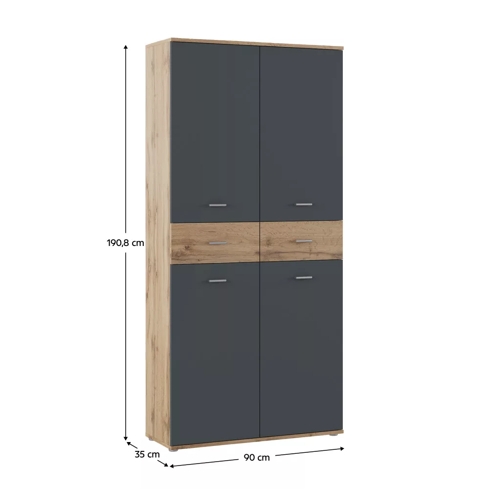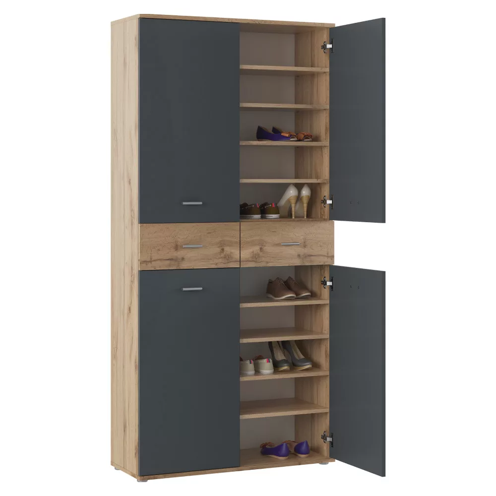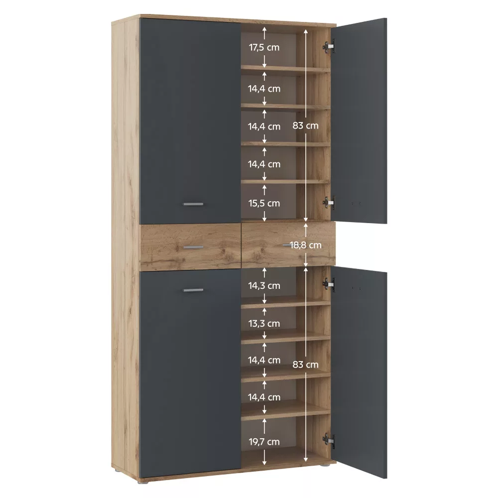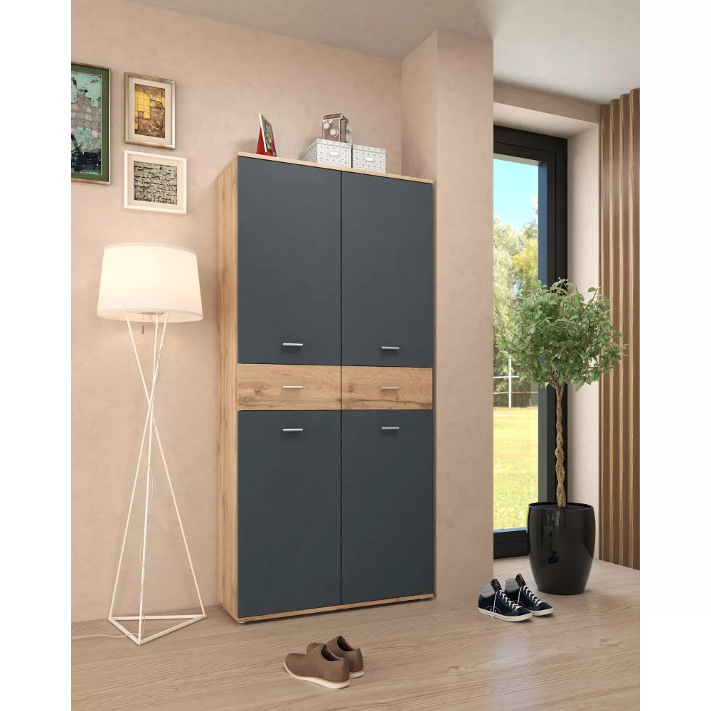 Egy rendezett és hívogató előszoba megteremtése gyakran kihívást jelent, különösen, ha a cipők és kiegészítők tárolására kell hatékony megoldást találni. Az AVILOT cipősszekrény praktikus és esztétikus választ kínál erre a problémára. A modern grafit és wotan tölgy színkombinációban, tartós, 1,6 cm vastagságú laminált DTD-ből készült bútor nem csupán egy egyszerű cipőtartó, hanem egy sokoldalú tárolórendszer, amely az egész család számára elegendő helyet biztosít.