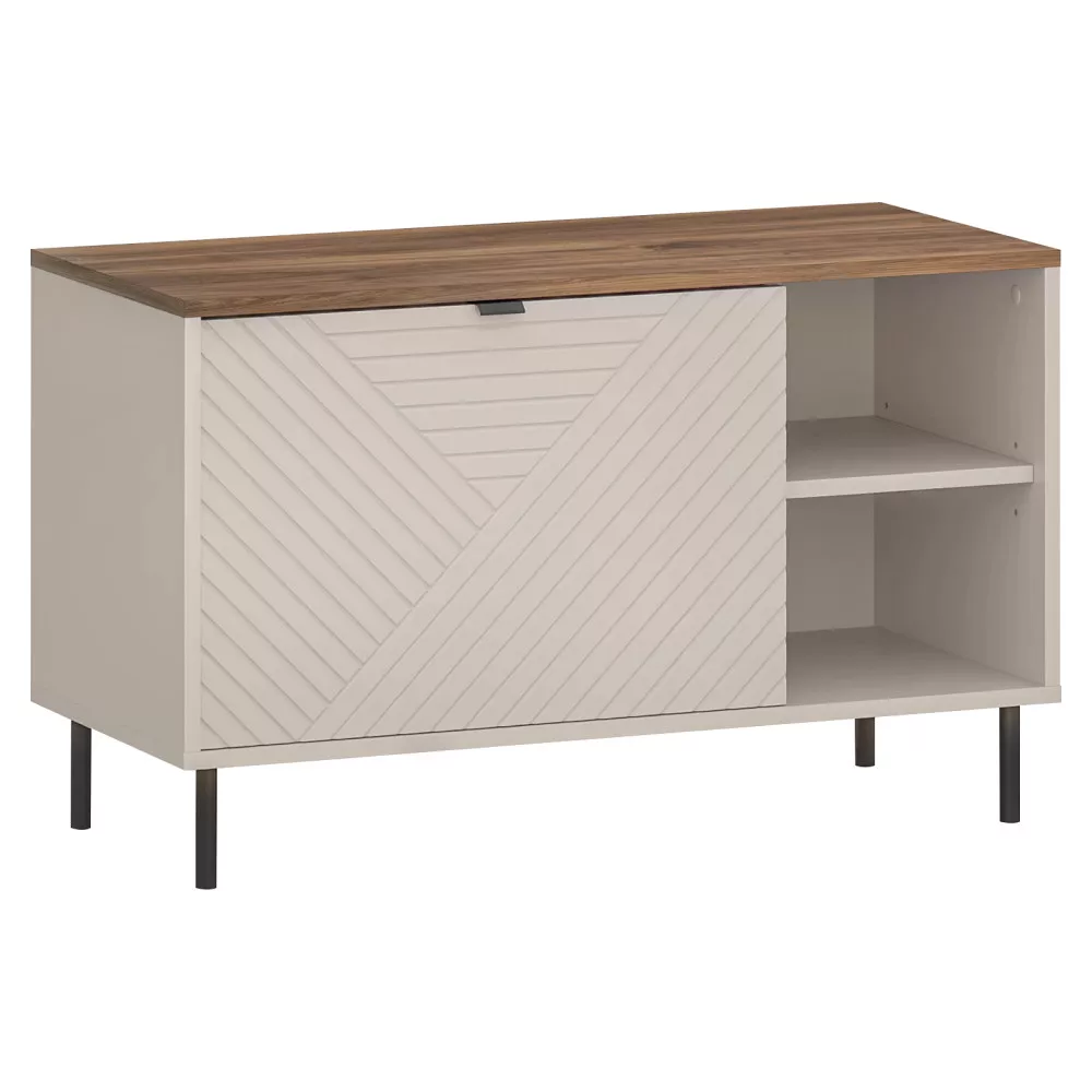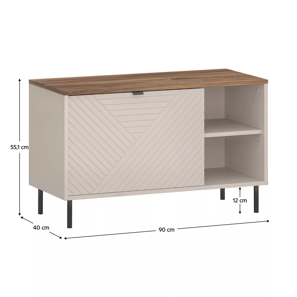 A minőségi anyaghasználat garantálja a bútor időtállóságát. A korpusz laminált DTD bútorlapból, míg a dekoratív ajtók fóliázott MDF-ből készülnek, ami hosszú távú tartósságot és könnyű tisztíthatóságot biztosít. Az ABS élek hatékonyan védik a bútort a mindennapi használat során előforduló karcolásokkal és mechanikai sérülésekkel szemben. A lágy kasmír és a meleg tónusú castello tölgy harmonikus párosa modern, mégis barátságos hangulatot teremt, míg a kontrasztos fekete fém lábak és fogantyúk egy csipetnyi indusztriális eleganciát csempésznek az összhatásba. Ez a bútordarab tökéletes választás lehet cipőtartó vagy akár multifunkcionális cipős állvány gyanánt is.