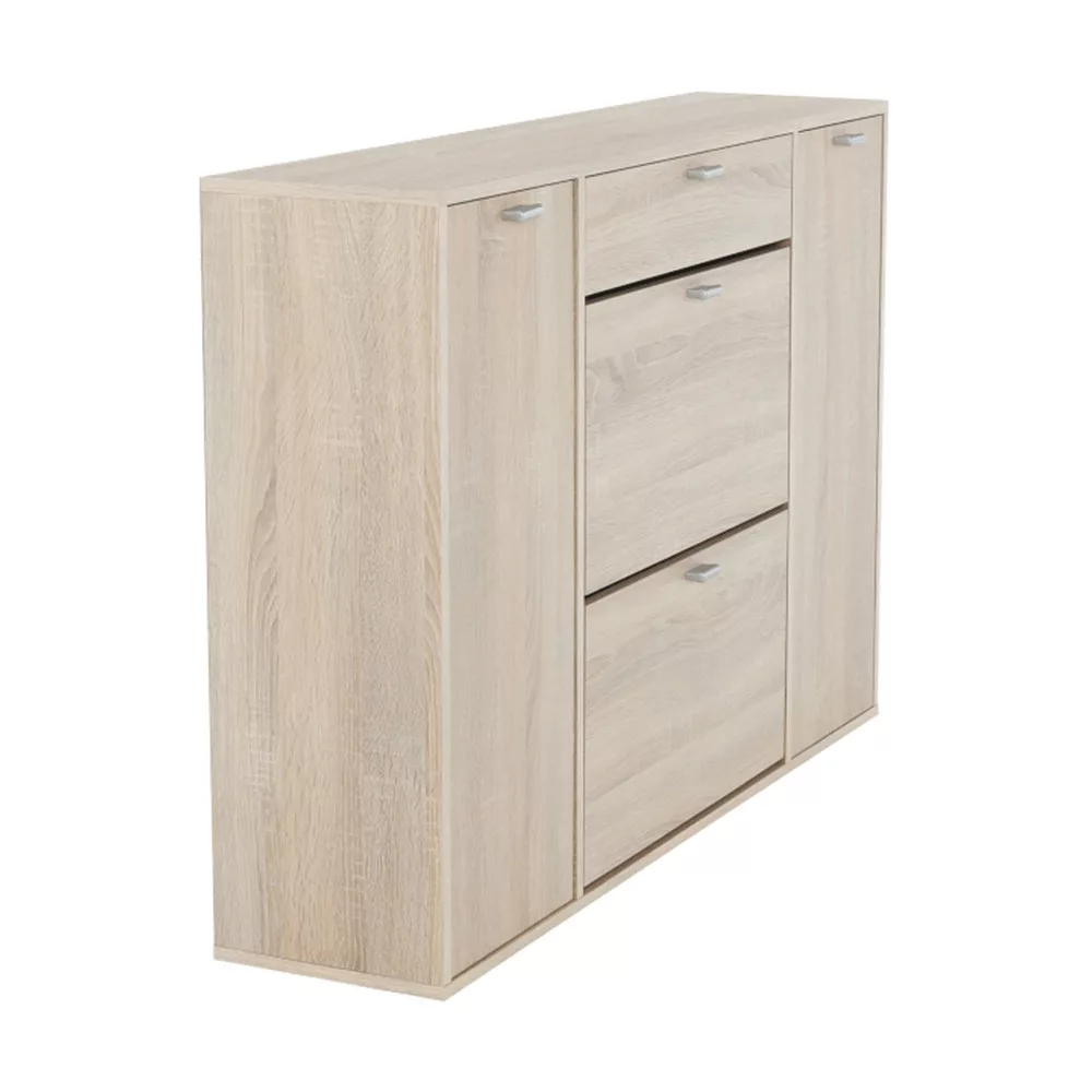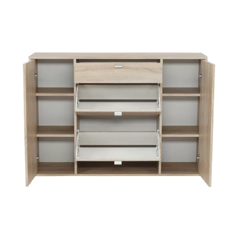 Az ANABELA nem csupán egy egyszerű cipőtartó. Kialakítása minden tárolási igényt kielégít: a két oldalsó, ajtós szekrény mellett két nyitott polc, egy praktikus fiók a kulcsoknak és egyéb apróságoknak, valamint két tágas, billenőfiók biztosítja a cipők rendezett és átlátható elhelyezését. A 27,5 cm mélységű billenő részek ideálisak a mindennap használt lábbelik számára, míg a szekrényekben a szezonális vagy ritkábban hordott darabok is kényelmesen elférnek.