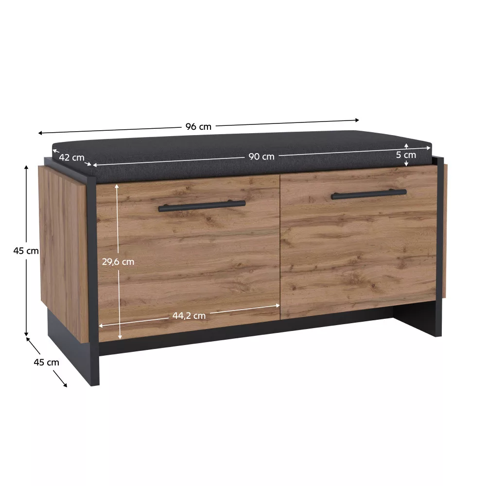 A tervezés során minden apró részletre odafigyeltünk. A természetes fa dekor és a fekete elemek harmonikus kontrasztját a letisztult vonalvezetésű, fekete fém fogantyúk teszik teljessé. A gondos anyagválasztás biztosítja, hogy ez az előszobai cipőtároló hosszú távon is megőrizze esztétikai értékét és megbízhatóan szolgálja kényelmedet. Nem csupán egy egyszerű cipőspolc, hanem egy átgondolt bútordarab, amely rendszerezi a teret.