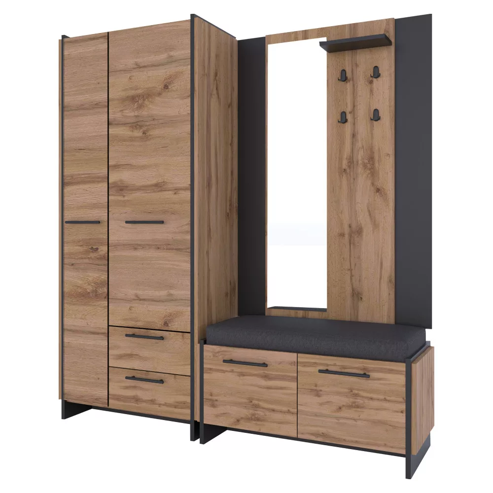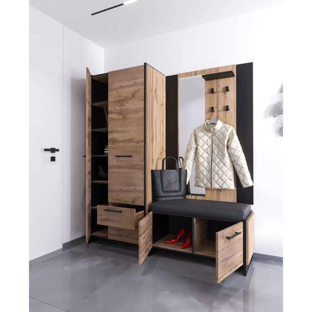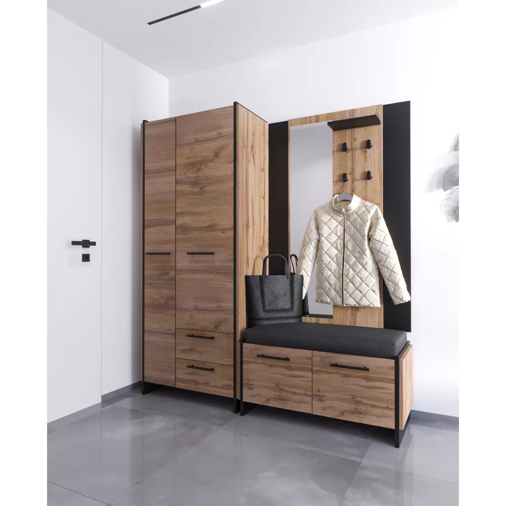 Az előszoba az első benyomás otthonodról; egy olyan tér, ahol a funkcionalitás és az esztétika találkozik. Ha egy olyan megoldást keresel, amely rendet teremt és egyben stílust is visz a bejárati részbe, fedezd fel az AMONI szektoros rendszer eleganciáját. Ez a cipősszekrény a wotan tölgy melegségét a fekete modern letisztultságával ötvözi, időtálló megjelenést kölcsönözve a helyiségnek. A bútordarab karakterét a dupla vastagságú laminált DTD bútortest és a sérüléseknek ellenálló ABS élek teszik igazán masszívvá és tartóssá.