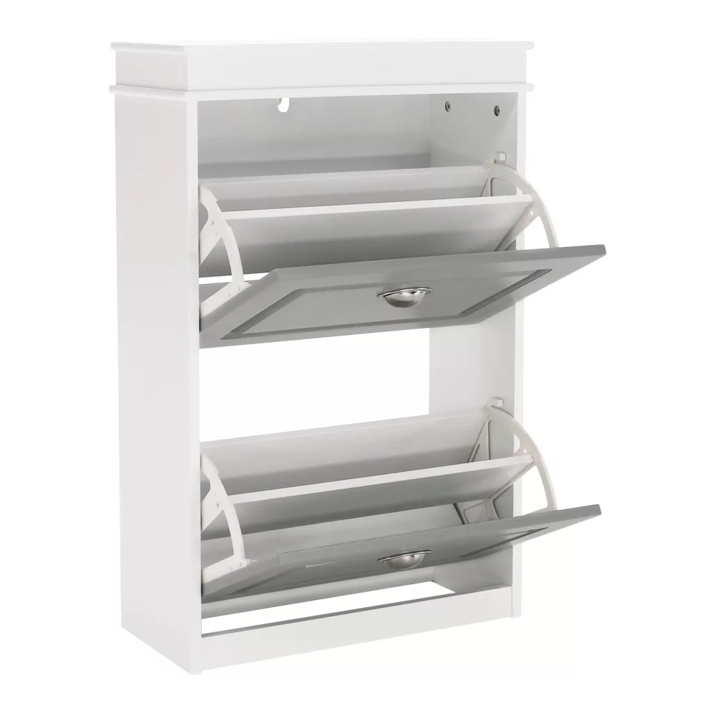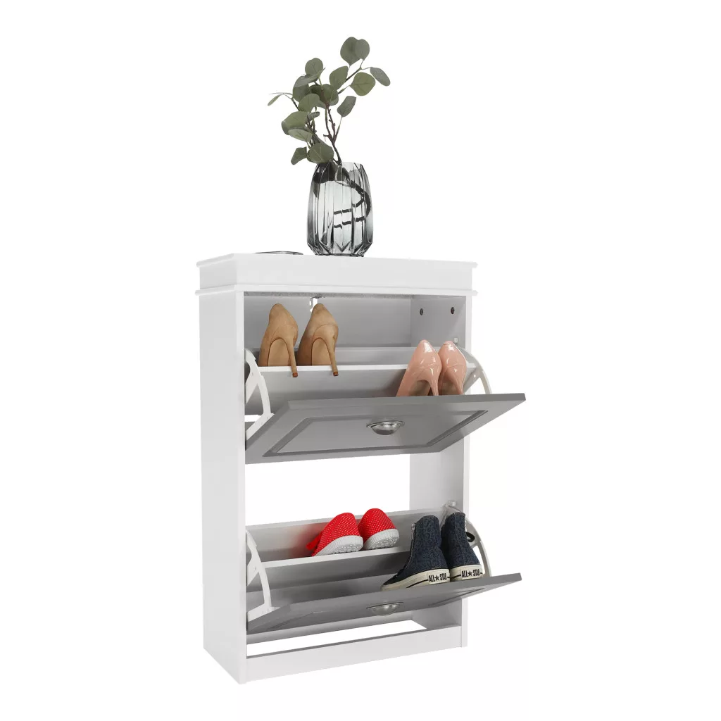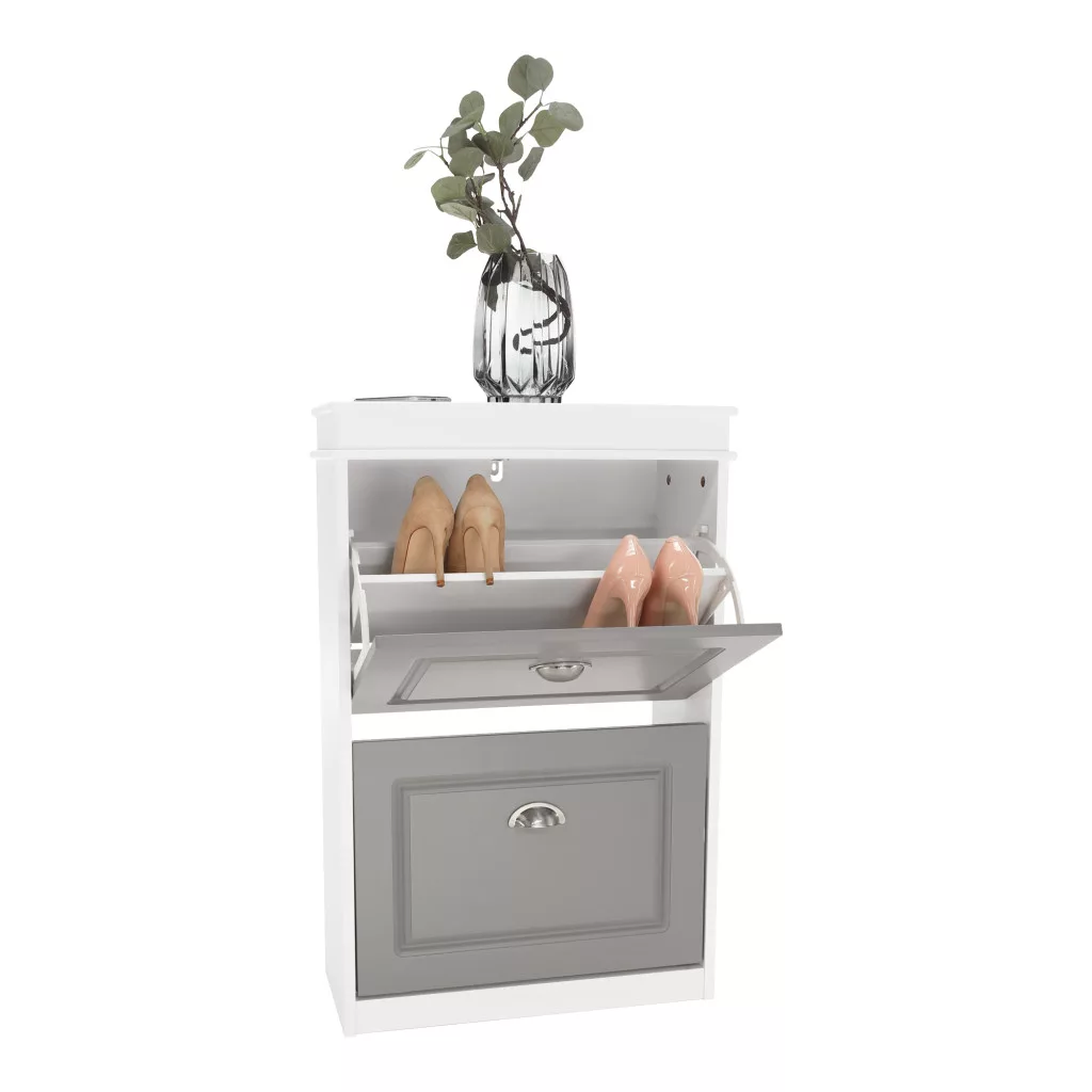 A SEBER TYP 1 cipőtartó egy olyan gyöngyszem, amely éppen erre a kihívásra kínál elegáns és praktikus megoldást. Ez a modern cipősszekrény tartós MDF és faforgácslap kombinációjából készült, a letisztult fehér és szürke színek harmonikus párosításával. Rengeteg tárhelyet biztosít két billenthető fiókjában, amelyekben akár 8 pár cipő is kényelmesen elfér. Jellegzetes fogantyúi finom részletként egészítik ki az összképet, egyedi és időtálló hatást keltve.