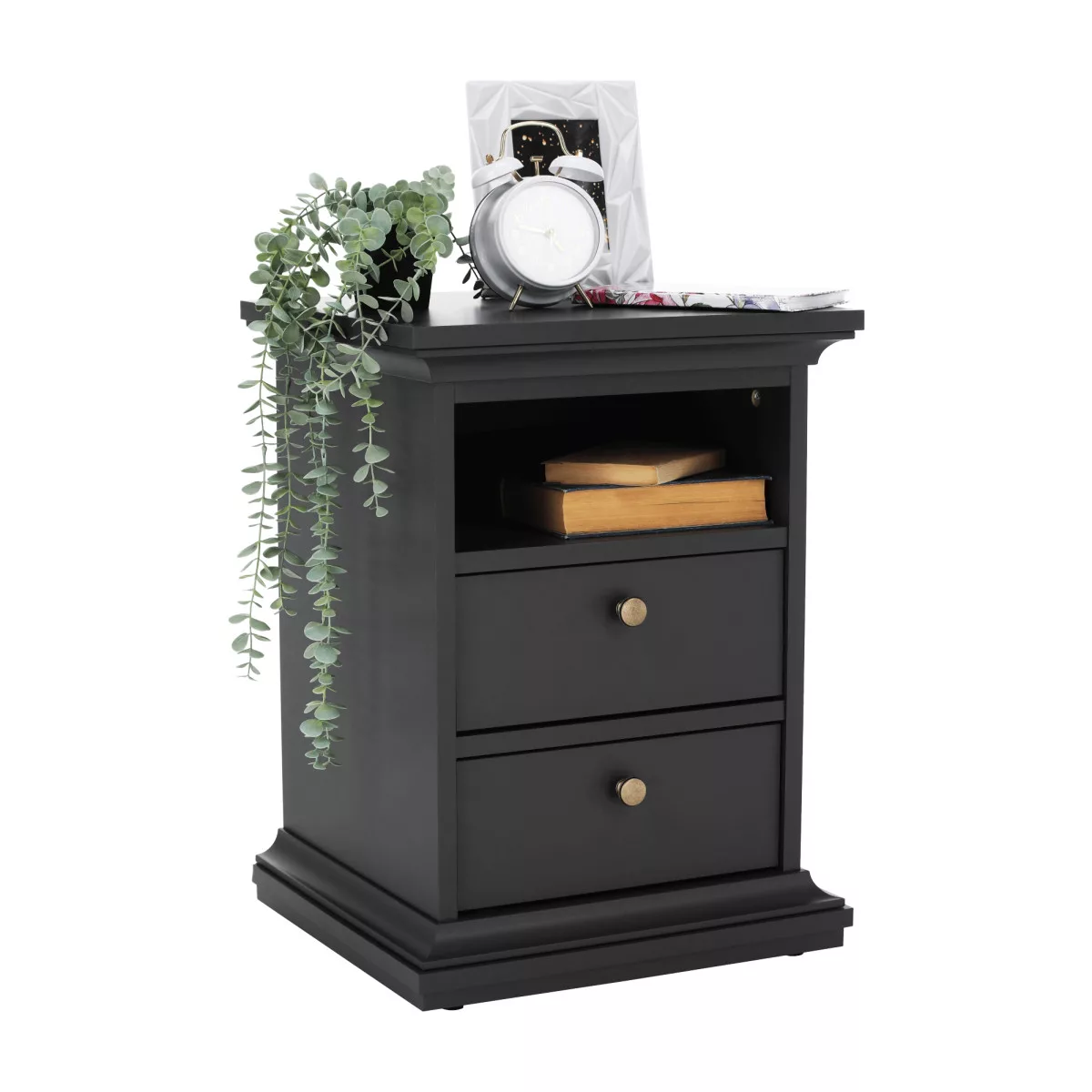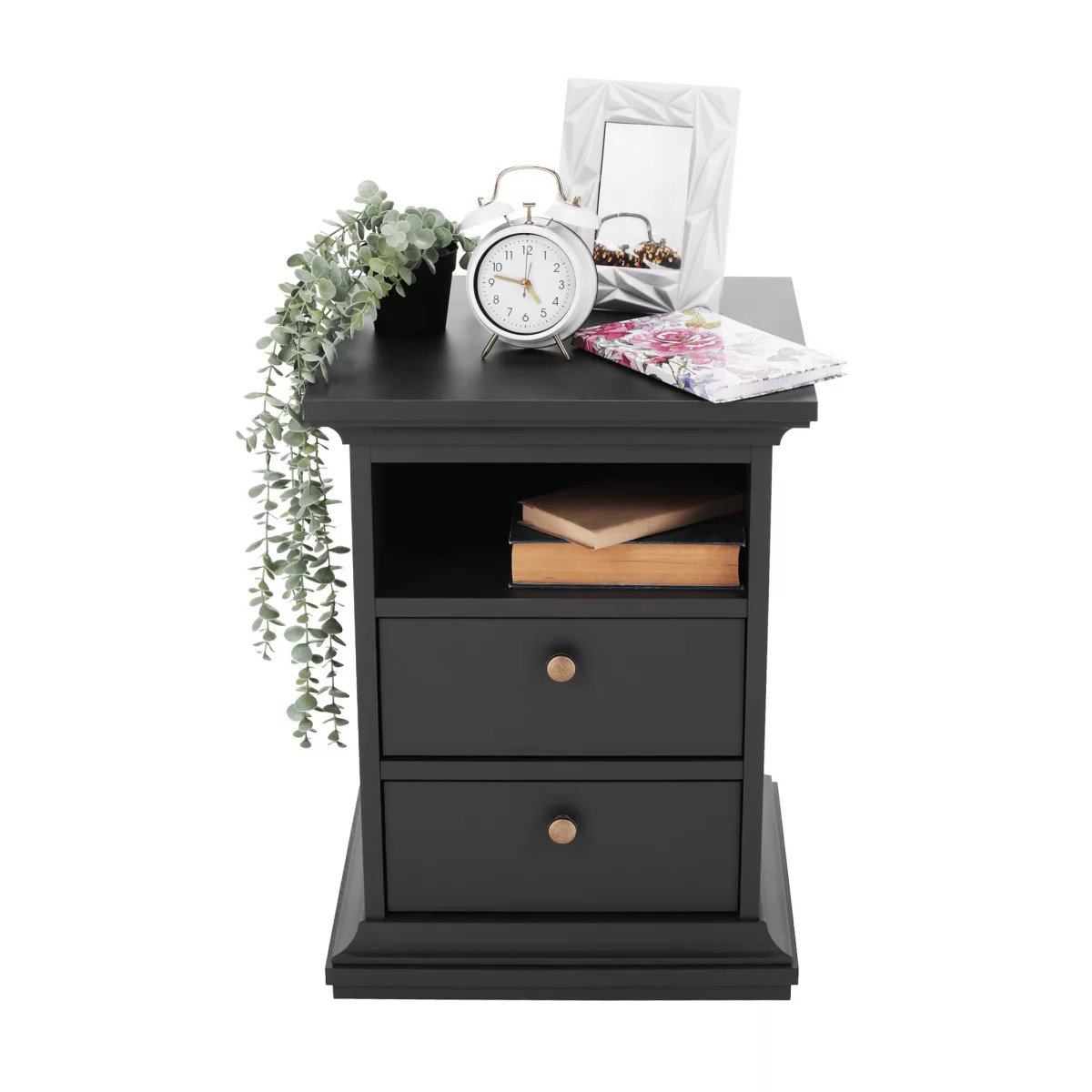 A praktikus kialakításnak köszönhetően minden kéznél lehet, amire az éjszakai pihenéshez szükséged van. A 43,6x40x58,8 cm (SzxVxH) méretű asztal kompakt, mégis tágas tárolási lehetőségeket kínál. A felső lap teherbírása 25 kg, így biztonsággal elhelyezhetsz rajta egy éjjeli lámpát és kedvenc könyveidet, míg a fiókok egyenként 5 kg terhelhetőséggel bírnak, ideálisak a személyes tárgyak diszkrét tárolására. A terméket a biztonságos szállítás érdekében szétszerelve szállítjuk.