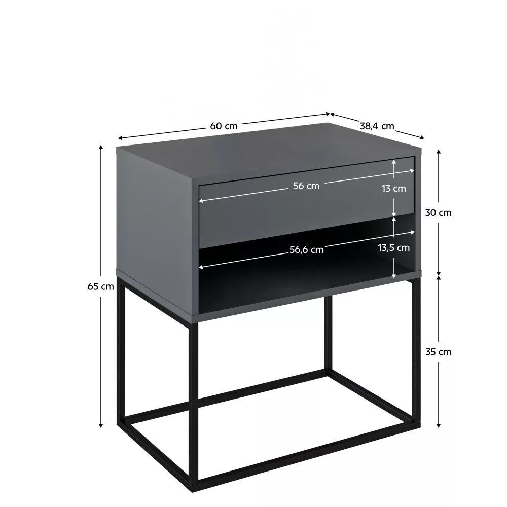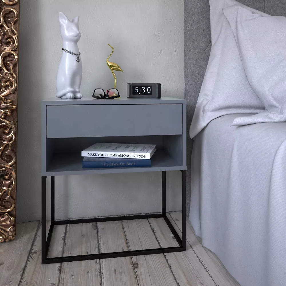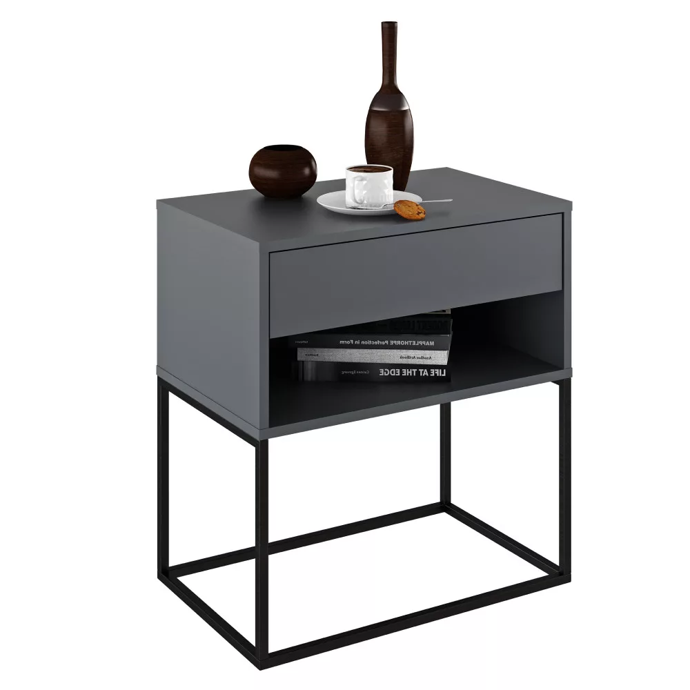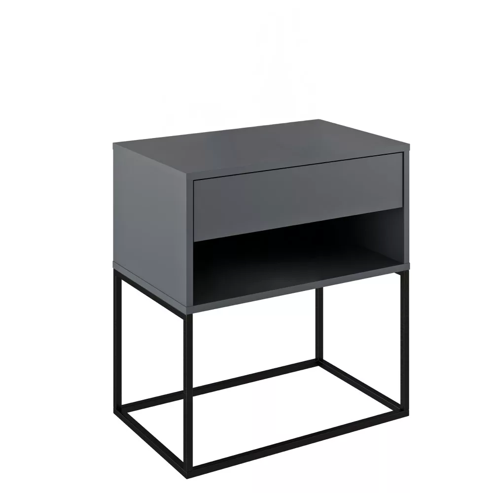 Gyakran szembesülsz azzal a kihívással, hogy egy bútordarabnak egyszerre kellene stílusosnak, praktikusnak és sokoldalúnak lennie? Az ARTI TYP 2 éjjeli asztal egy olyan átgondolt darab, amely tökéletesen megállja a helyét kisasztalként is. A modern, grafit színű, kiváló minőségű laminált DTD asztallap és a stabilitást biztosító, elegáns fekete fém talapzat kombinációja letisztult megjelenést kölcsönöz bármely térnek. Egy nyitott tárolóhellyel és egy tágas fiókkal rendelkezik, így segít a rendszerezésben és a letisztult környezet megteremtésében.