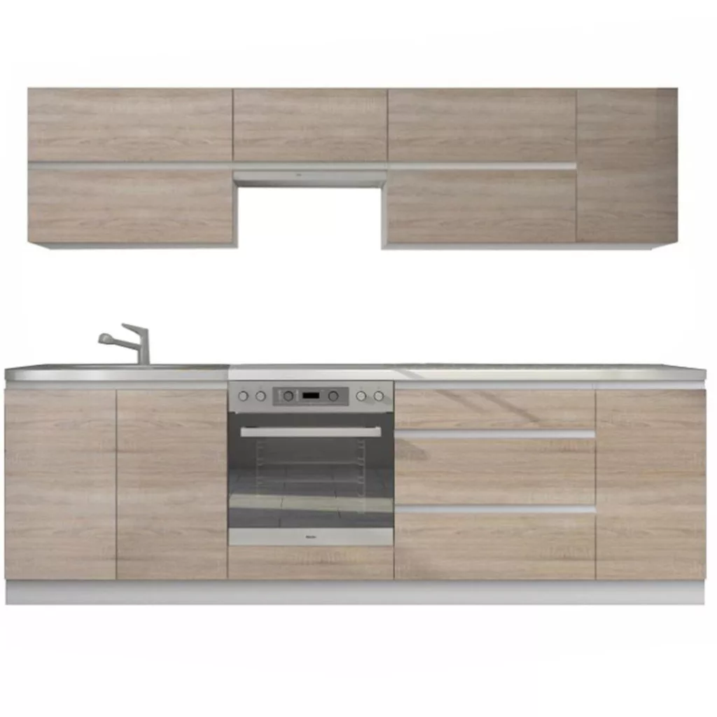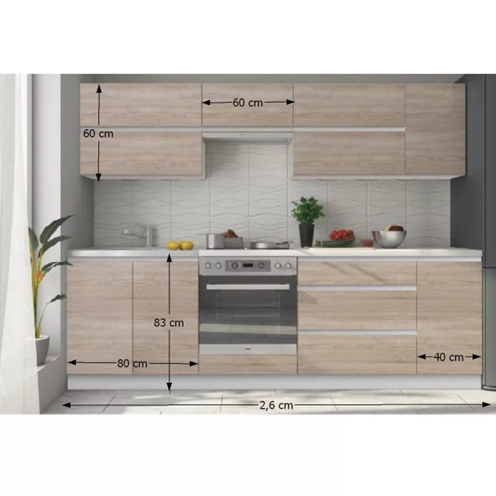 Ismerd meg a LINE NEW moduláris konyhabútort, egy modern és letisztult összeállítást, amely tökéletes választás lehet az új otthonodba vagy a régi konyhád megújításához. Ez a 2,6 méteres széria konyhabútor minőségi laminált faforgácslapból készült, amely a tartósságot és a könnyű tisztíthatóságot garantálja. A váz elegáns sonoma tölgy színét a ragyogó fehér frontok egészítik ki, világos és tágas érzetet keltve a térben.