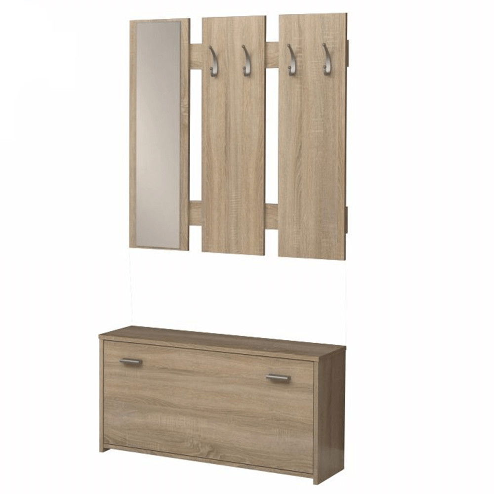 A LADA NEW előszoba szett egy modern és komplett megoldás, amely azonnal rendet és stílust teremt otthonod bejáratában. Ez a laminált DTD bútorlapból készült, kellemes sonoma tölgyfa színvilágú előszoba panel egy cipősszekrényből, egy akasztós fogas panelből és egy tükörből áll, mindent biztosítva, amire a tökéletes fogadtatáshoz szükséged lehet.