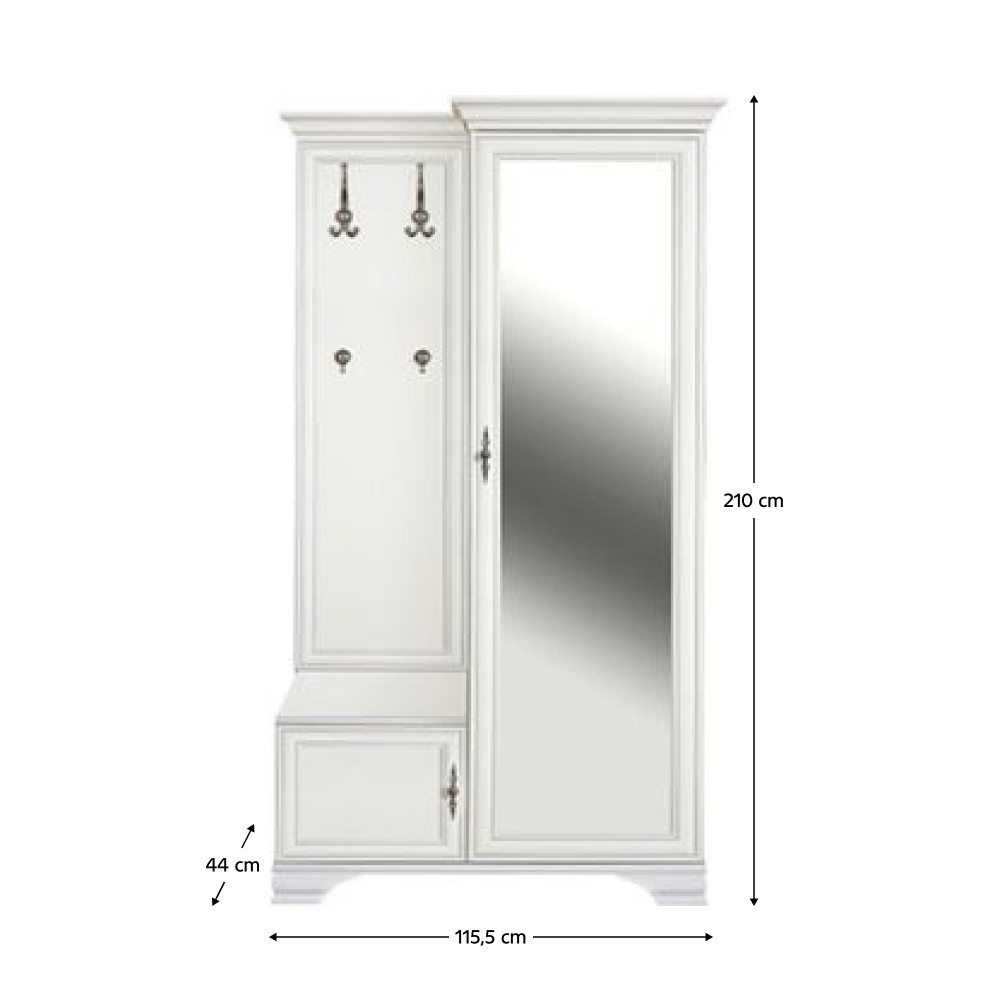 A KENTAK rendszer minden részletét a minőség és a kifinomult esztétika jegyében alkottuk meg. A letisztult fehér felületeket az antik ezüst színű, masszív fémből készült stílusos fogantyúk és kampók teszik teljessé, elegáns kontrasztot teremtve. A bútorok praktikus kialakításúak, a bemutatott előszoba szett például mindent tartalmaz, amire a rendszerezett tároláshoz szükséged lehet: tágas tárhelyet, egy beépített tükröt, egy szekrényt polccal és egy praktikus akasztós részt a kabátok számára.