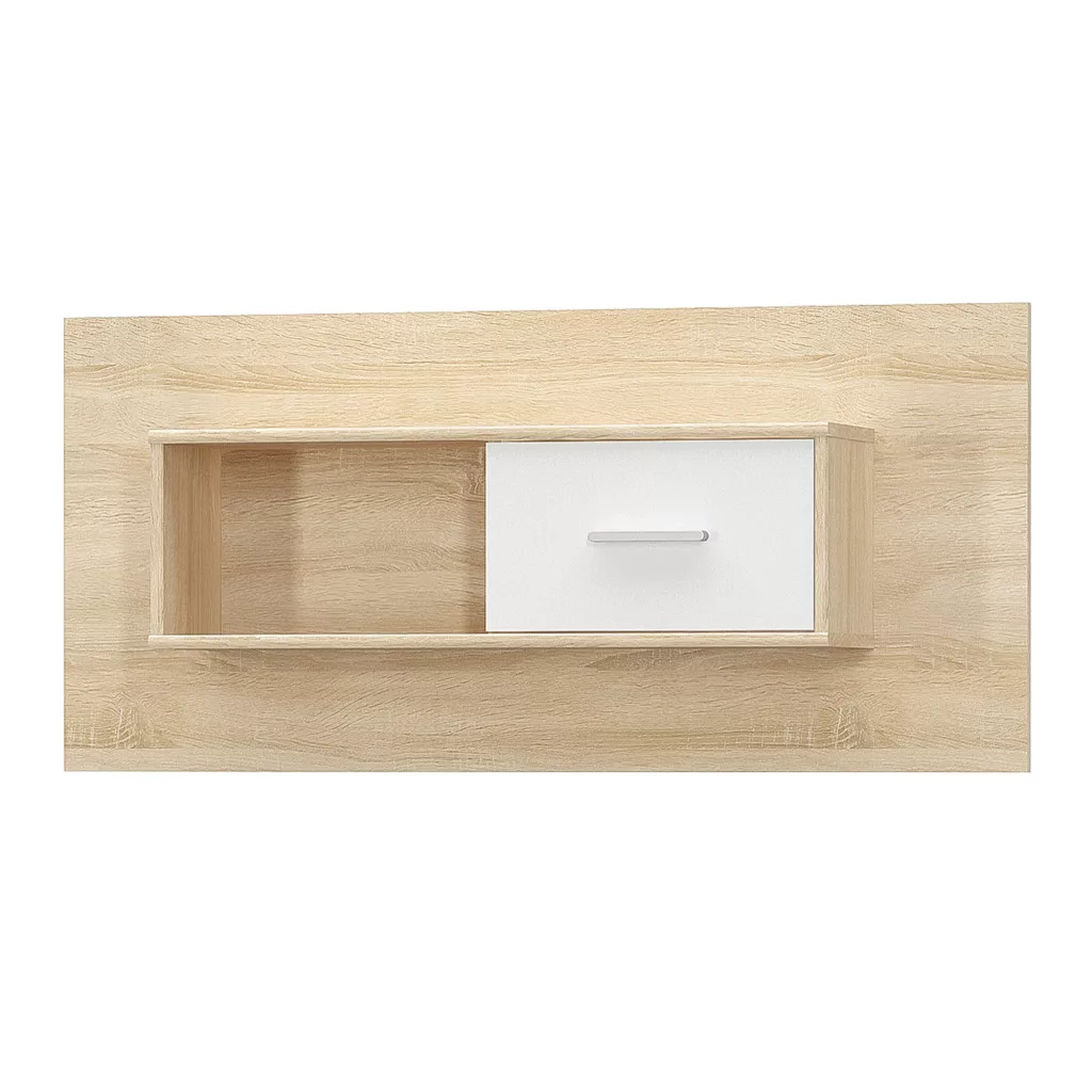 A TEYO fali polc segít rendet teremteni a gyerekszobában, miközben teret enged a fantáziának és a játéknak. Ez a sokoldalú tároló polc fehér és sonoma tölgy színkombinációjával, valamint 120x23x55 cm-es méretével és a 16 mm vastag, minőségi laminált DTD anyagával ideális választás a kis szuperhősök birodalmába. Az átgondolt tervezés egy zárt, ajtóval ellátott szekrényrészt és nyitott polcokat is magában foglal, így a könyvek és a kedvenc játékok is méltó helyükre kerülhetnek.