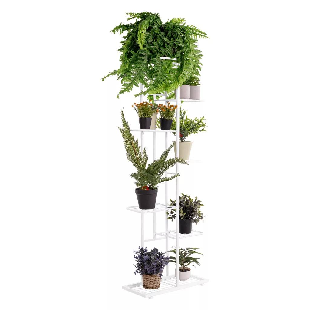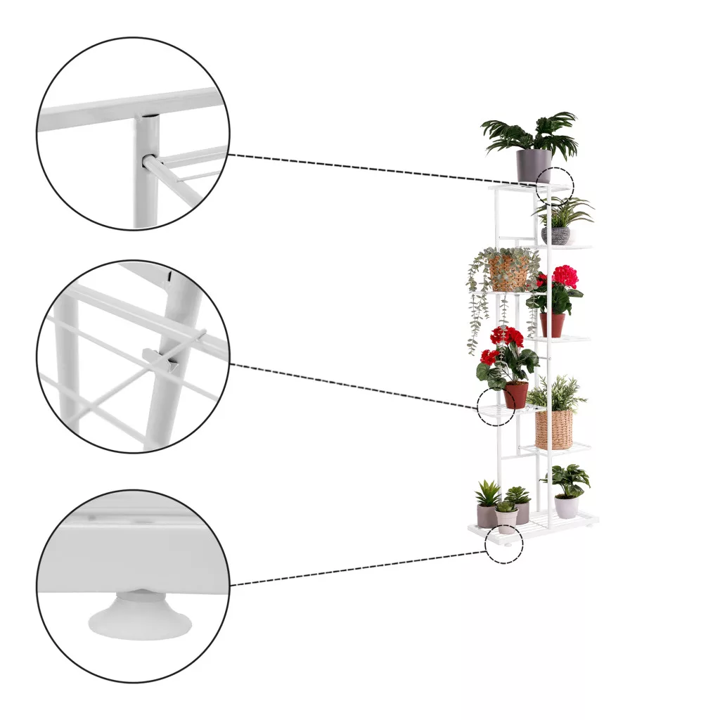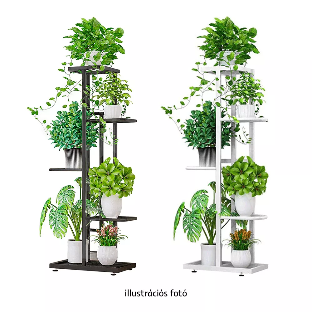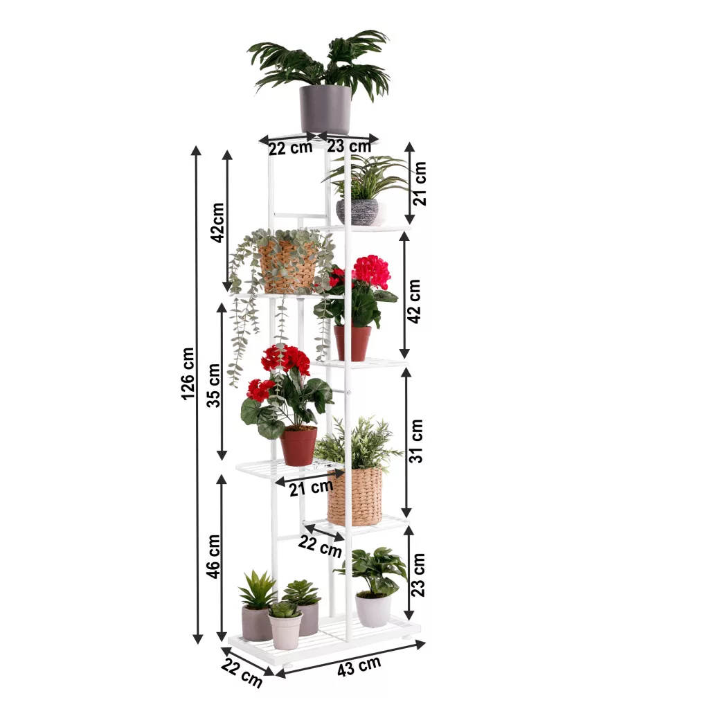 A stabil fém szerkezet hosszú élettartamot garantál, míg a letisztult fehér színvilág bármilyen enteriőrbe könnyedén beilleszthető, kiemelve növényeid természetes szépségét. A hét, különböző magasságban elhelyezett polc dinamikus és látványos elrendezést tesz lehetővé, így minden növényed megkapja a szükséges teret és fényt a növekedéshez. Ez a sokoldalú növényállvány nemcsak beltéri virágtartóként funkcionál kiválóan, hanem egy védett teraszon vagy erkélyen is megállja a helyét, mint praktikus **kerti virágállvány**.