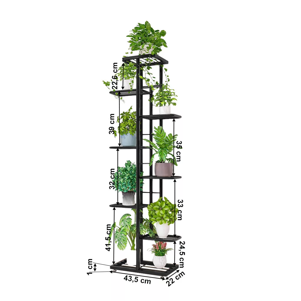 Ez a sokoldalú virágtartó állvány a funkcionalitást elegáns megjelenéssel ötvözi. A masszív fém szerkezet garantálja a stabilitást, míg a nyolc, különböző magasságban elhelyezett polc dinamikus és izgalmas elrendezést tesz lehetővé cserepes növényeid számára. Tökéletes választás beltéri virágtartóként a nappali egy napfényes sarkába, de akár fedett teraszon kerti virágállványként is megállja a helyét. A lábakon található rugalmas csúszkák pedig biztosítják, hogy az állvány még egyenetlen felületeken is tökéletesen stabilan álljon, megóvva kedvenceidet.