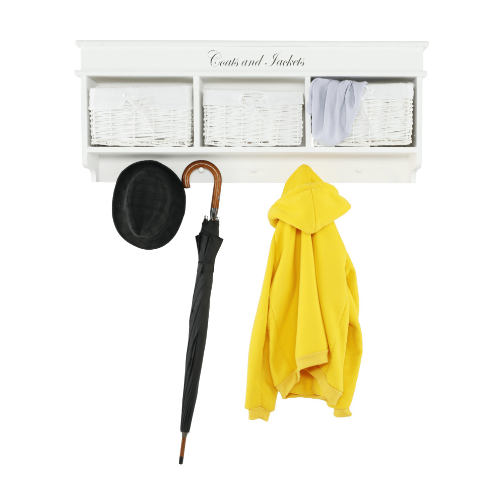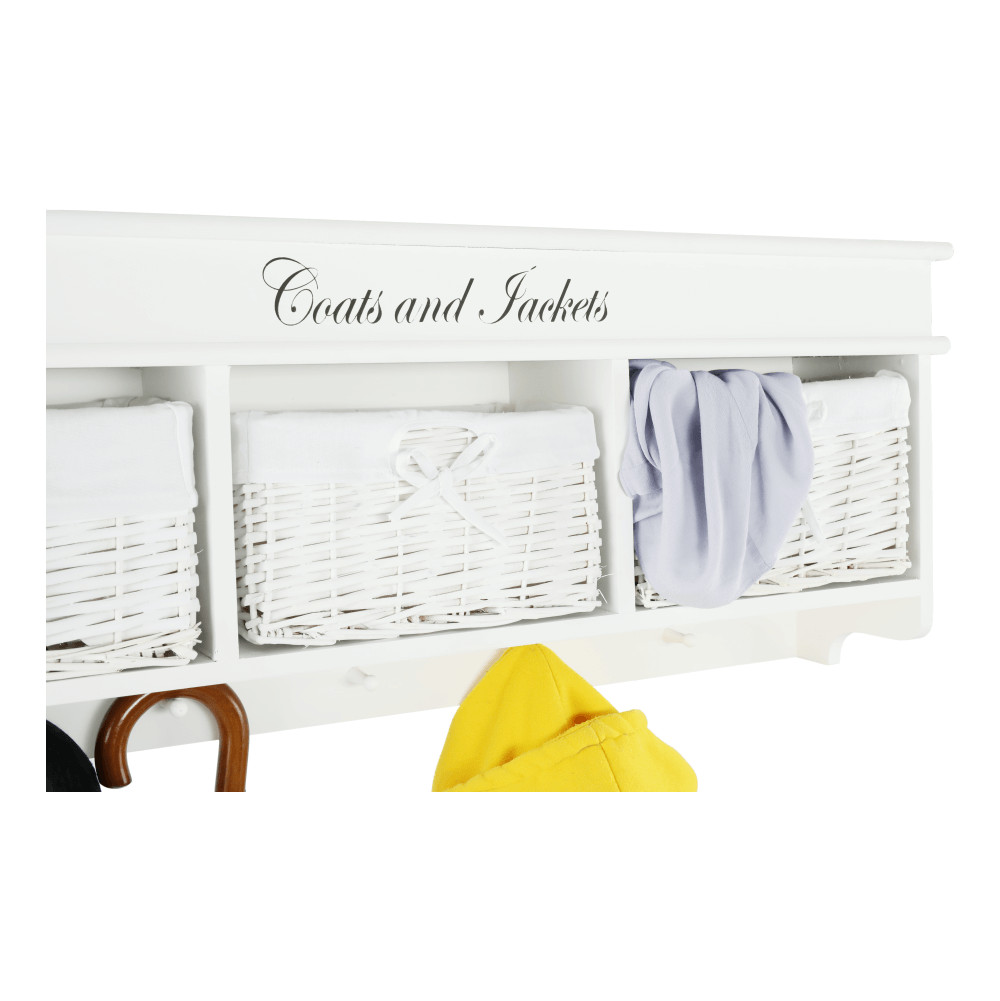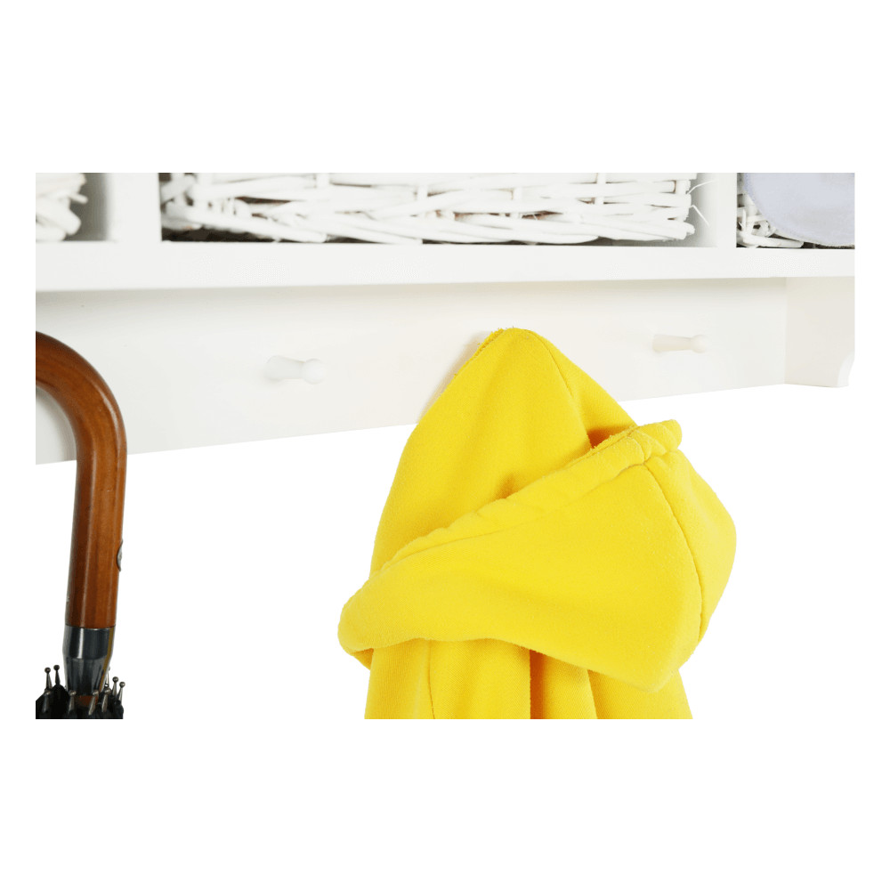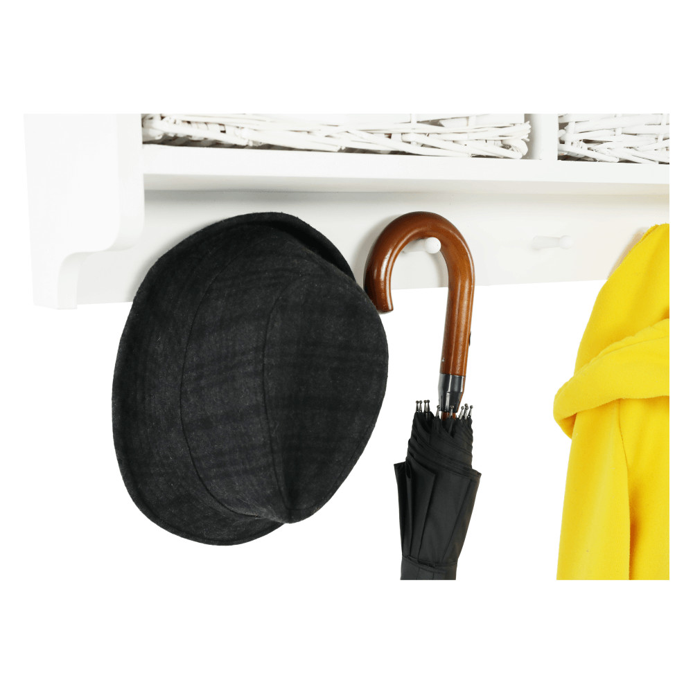 Ez a tömör fából és vesszőből készült, fehér színű ruhafogas nem csupán egy egyszerű kabáttartó, hanem egy komplett tárolórendszer, amely kiválóan funkcionál ruhaakasztóként is. Öt masszív kampóval rendelkezik, amelyek bőséges helyet biztosítanak a kabátoknak és egyéb ruhadaraboknak. A dizájn igazi különlegessége a beépített rakodótér: három elegáns, fonott kosár és egy felső polc gondoskodik a sálak, sapkák, kesztyűk és egyéb apróságok diszkrét és rendezett tárolásáról. Egyedi megjelenése minden falon kiemelkedik, tökéletes kiegészítőjévé válva az előszobádnak.