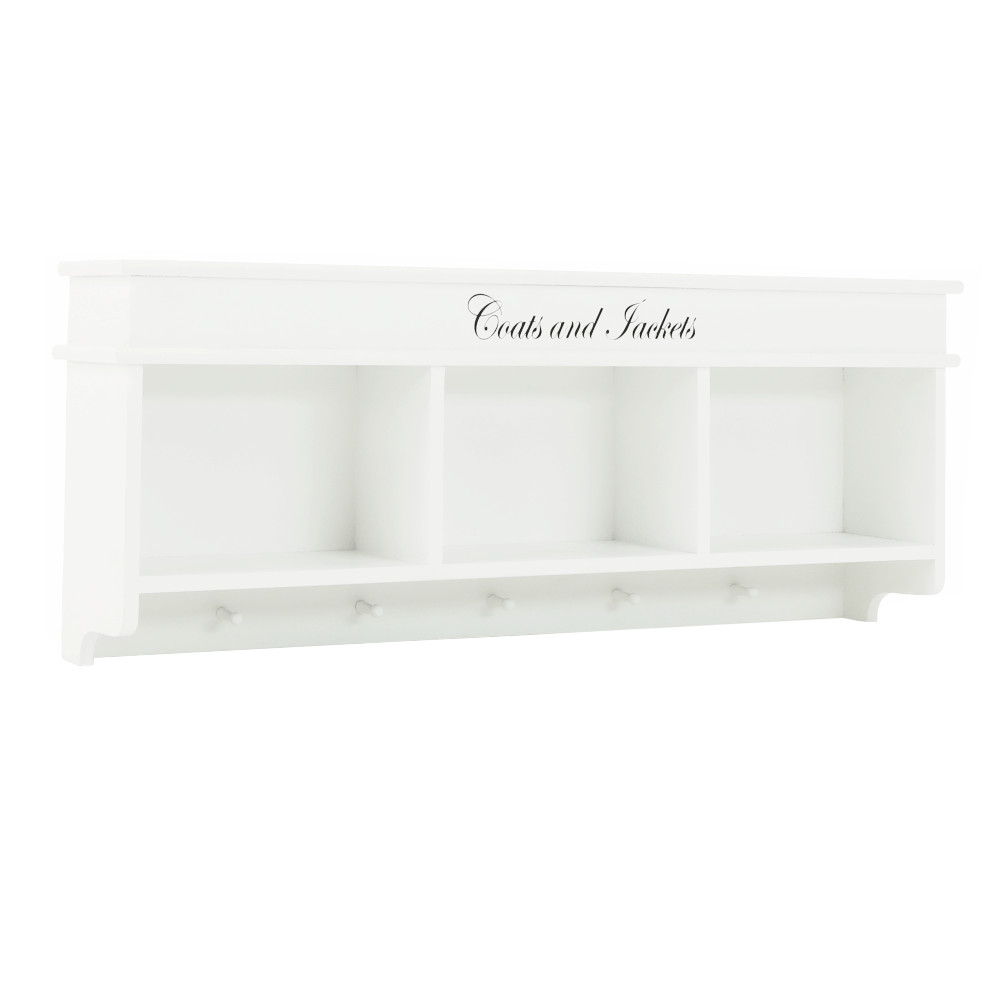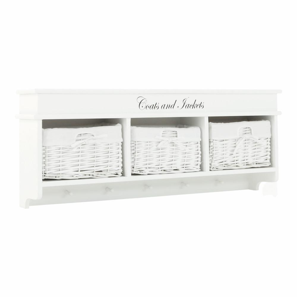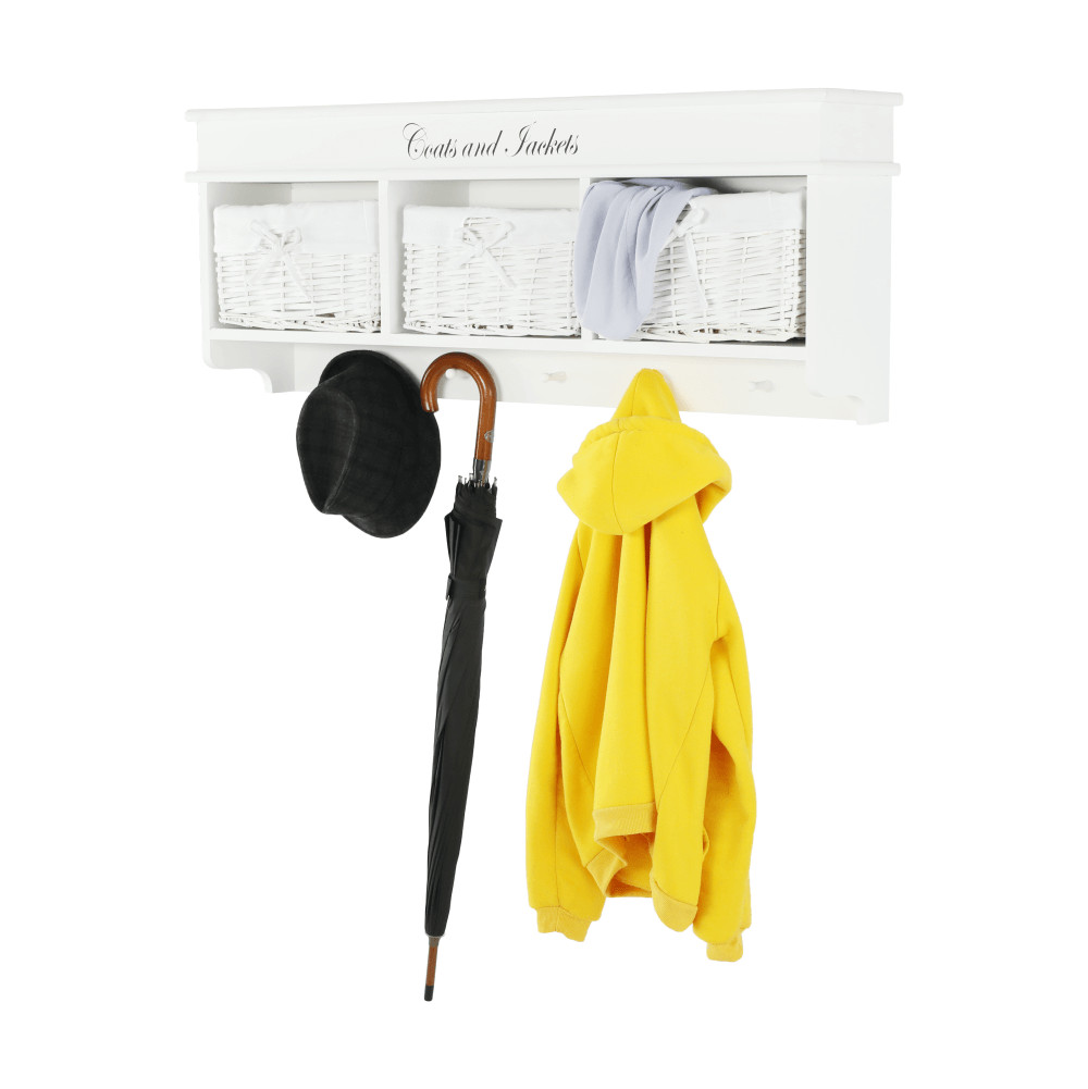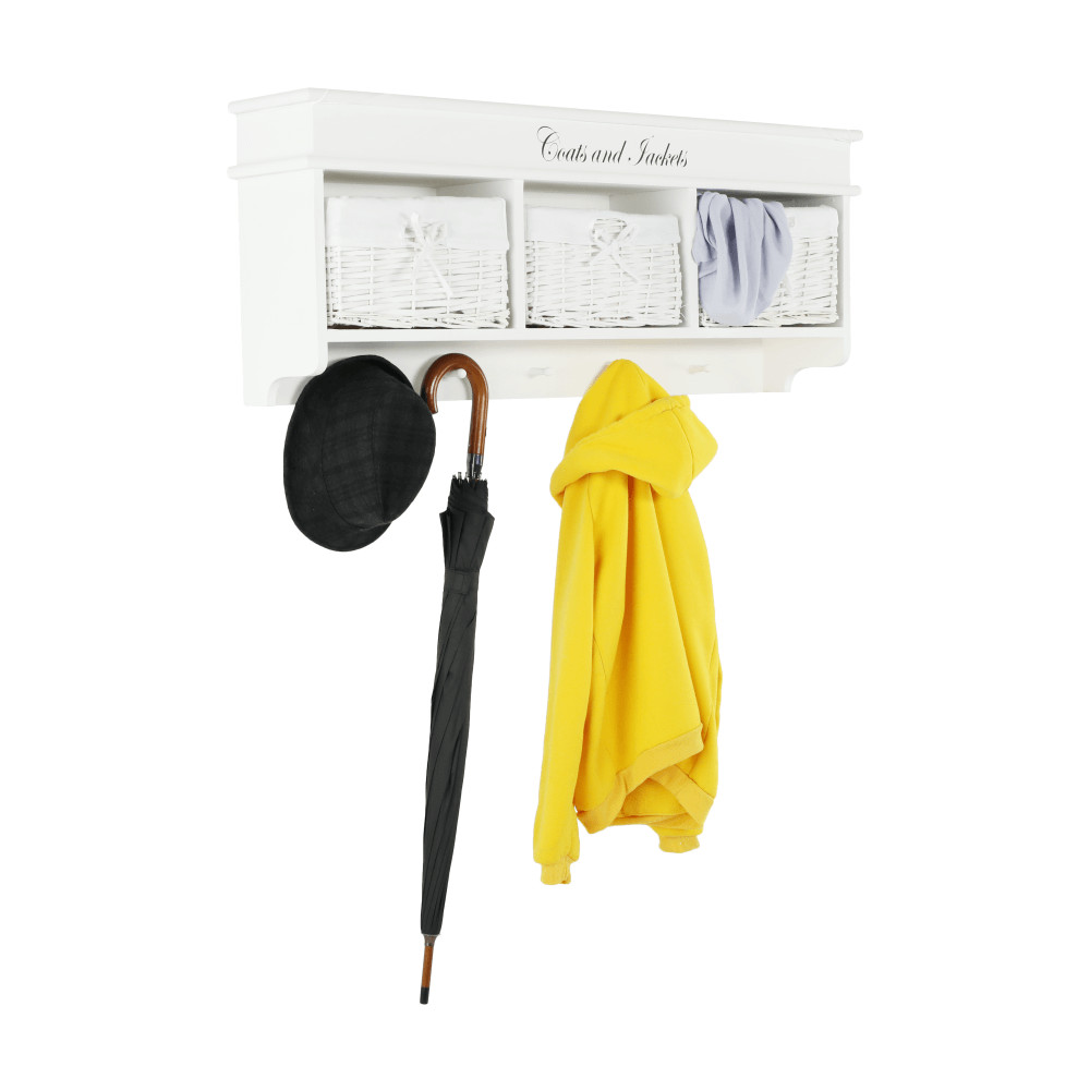 Ez a tömör fából és vesszőből készült, fehér színű ruhafogas nem csupán egy egyszerű kabáttartó, hanem egy komplett tárolórendszer, amely kiválóan funkcionál ruhaakasztóként is. Öt masszív kampóval rendelkezik, amelyek bőséges helyet biztosítanak a kabátoknak és egyéb ruhadaraboknak. A dizájn igazi különlegessége a beépített rakodótér: három elegáns, fonott kosár és egy felső polc gondoskodik a sálak, sapkák, kesztyűk és egyéb apróságok diszkrét és rendezett tárolásáról. Egyedi megjelenése minden falon kiemelkedik, tökéletes kiegészítőjévé válva az előszobádnak.