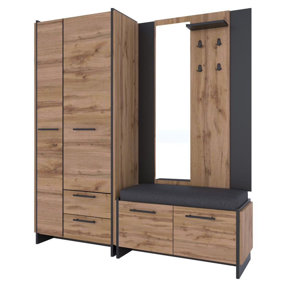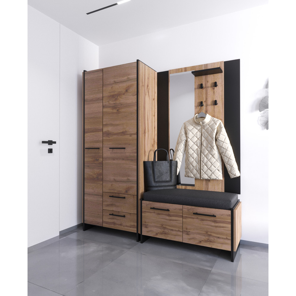 Az AMONI kollekció modern fogaspanele a wotan tölgy és fekete színkombinációjával éppen ezt a harmóniát teremti meg. Ez a fali akasztó a dupla vastagságú laminált DTD bútortestnek köszönhetően masszív és karakteres megjelenést biztosít, míg az ABS élek védelmet nyújtanak a mindennapi használat során keletkező sérülésekkel szemben. A természetes fa dekor és a fekete elemek kontrasztja időtlen eleganciát kölcsönöz a bútornak, a fekete fém fogantyúk pedig finoman hangsúlyozzák a modern dizájnt.