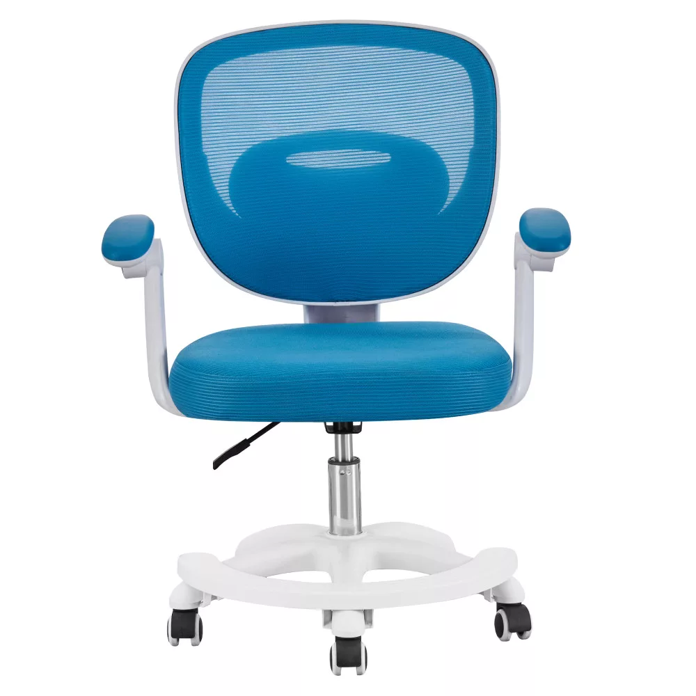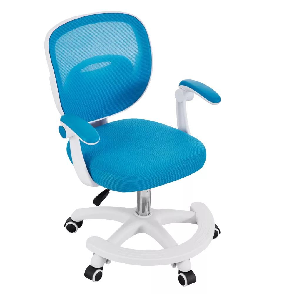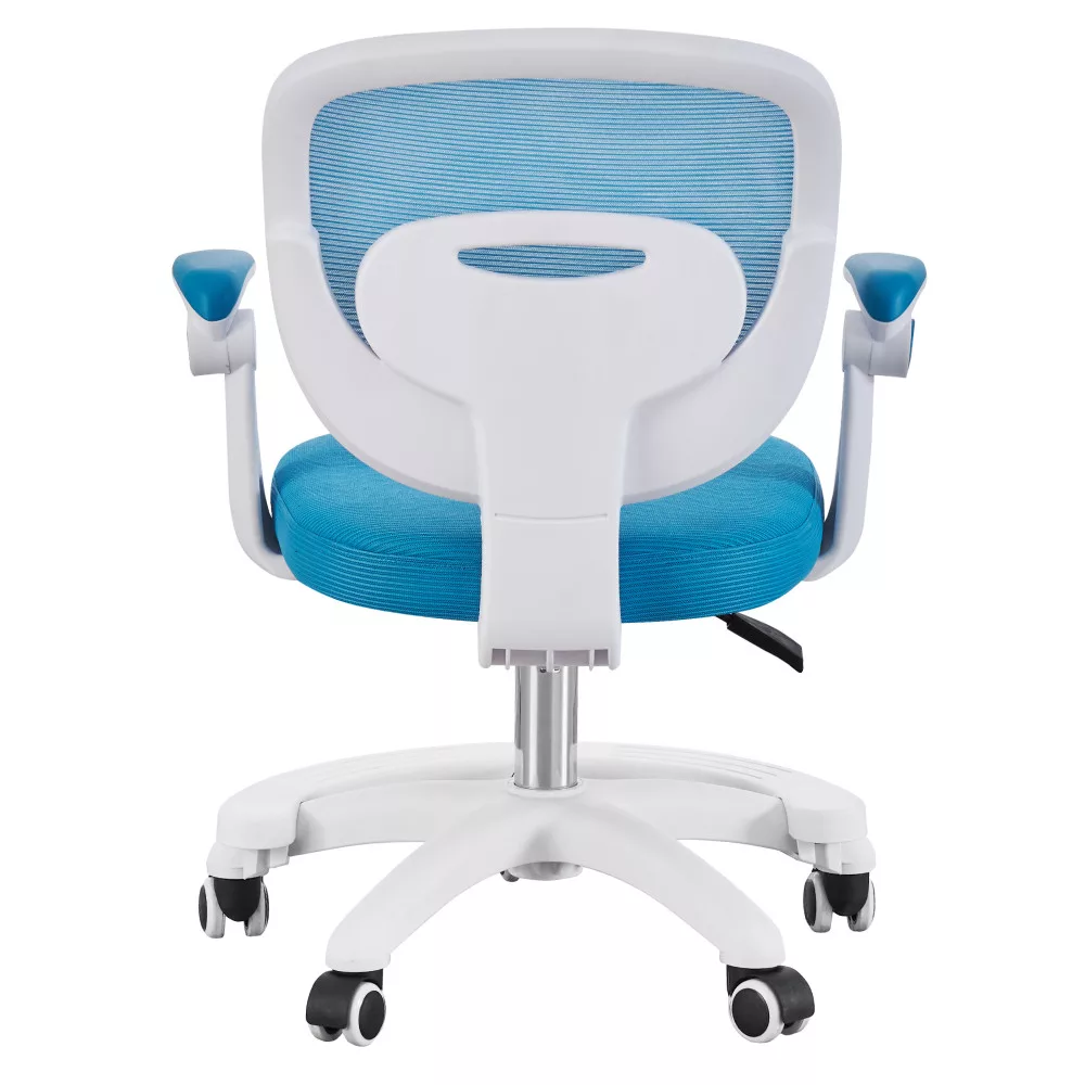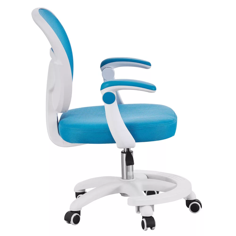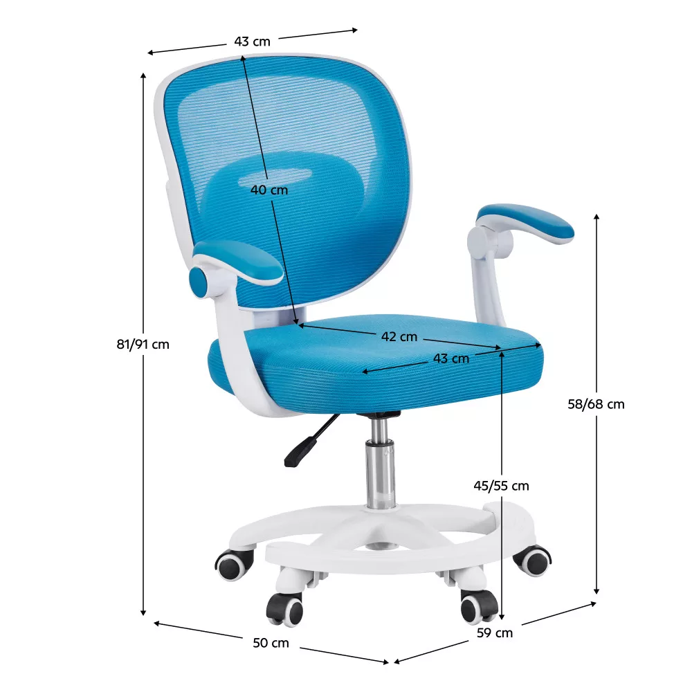 A kényelemről és a tartósságról a légáteresztő, kék színű hálós anyag gondoskodik, amelynek kopásállósága a Martindale teszt szerint kiemelkedő, 90 000 ciklus, így hosszú távon is megőrzi minőségét. A modern, fehér műanyag váz stabil alapot nyújt, míg az univerzális kerekek könnyed és csendes mozgást tesznek lehetővé puha szőnyegen és kemény padlón egyaránt. Ez a sokoldalú görgős szék így bármilyen gyerekszobában megállja a helyét. A felhajtható karfáknak köszönhetően a szék használaton kívül könnyedén az asztal alá tolható, helyet takarítva meg a szobában.