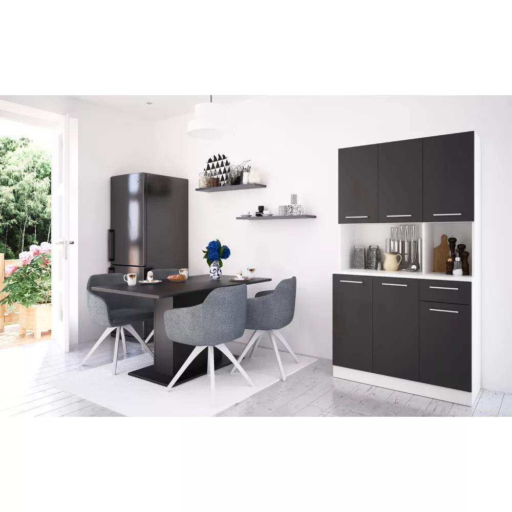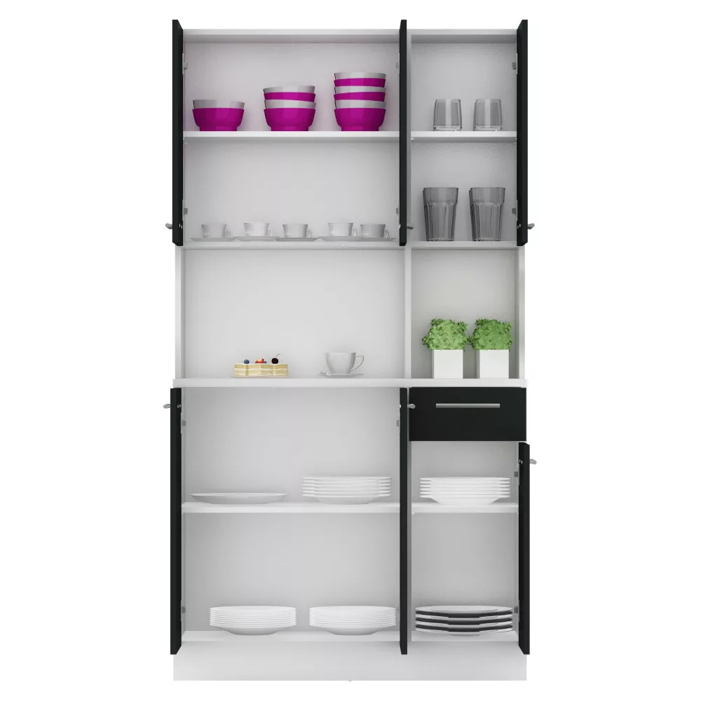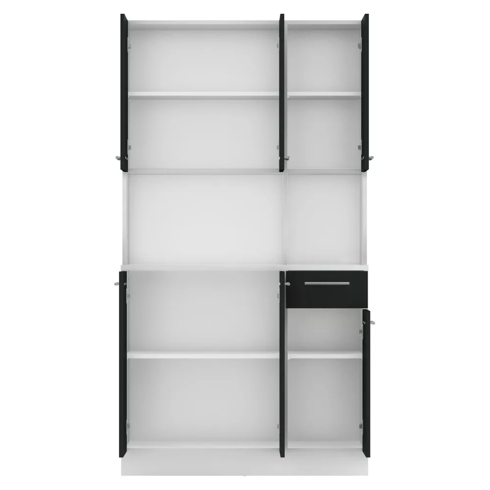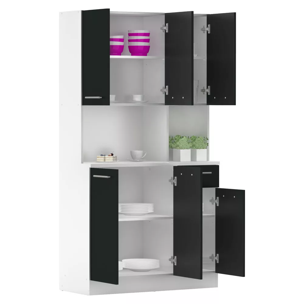 Egy jól szervezett konyha nem csupán esztétikai kérdés, hanem a mindennapi nyugalom és hatékonyság záloga is. A PELION NEW hatajtós kredencet pontosan erre a célra terveztük: hogy segítsen Neked egy rendezett és inspiráló környezetet teremteni. Ez a bútordarab a tartós, laminált DTD alapanyagnak, valamint a letisztult fehér és fekete színkombinációnak köszönhetően frissességet és modern eleganciát visz otthonodba. A hat tágas ajtó és a praktikus fiók bőséges tárolóhelyet kínál, így minden konyhai eszközödnek, étkészletednek és dekorációdnak megtalálhatod a tökéletes helyét.