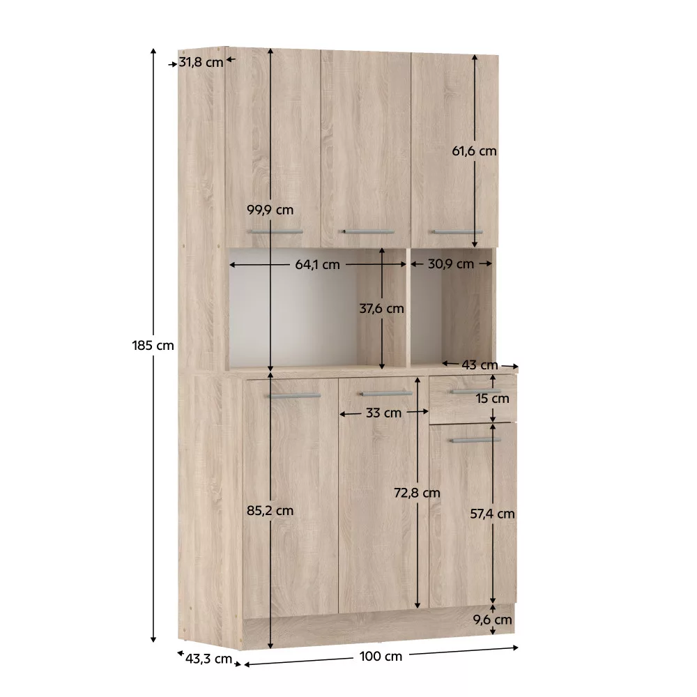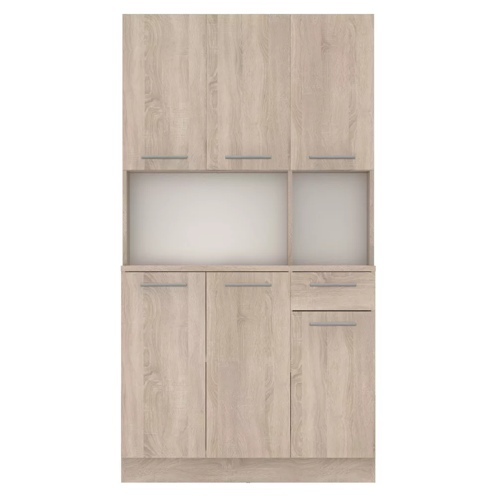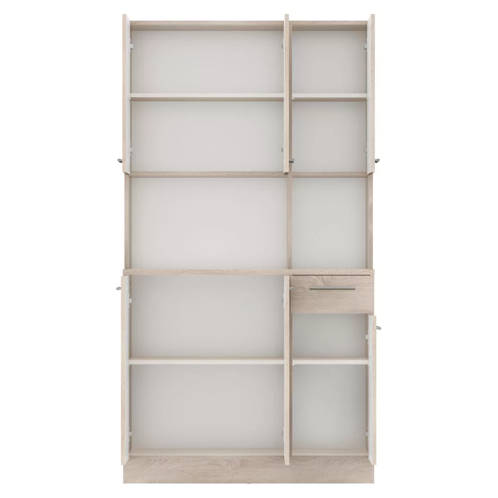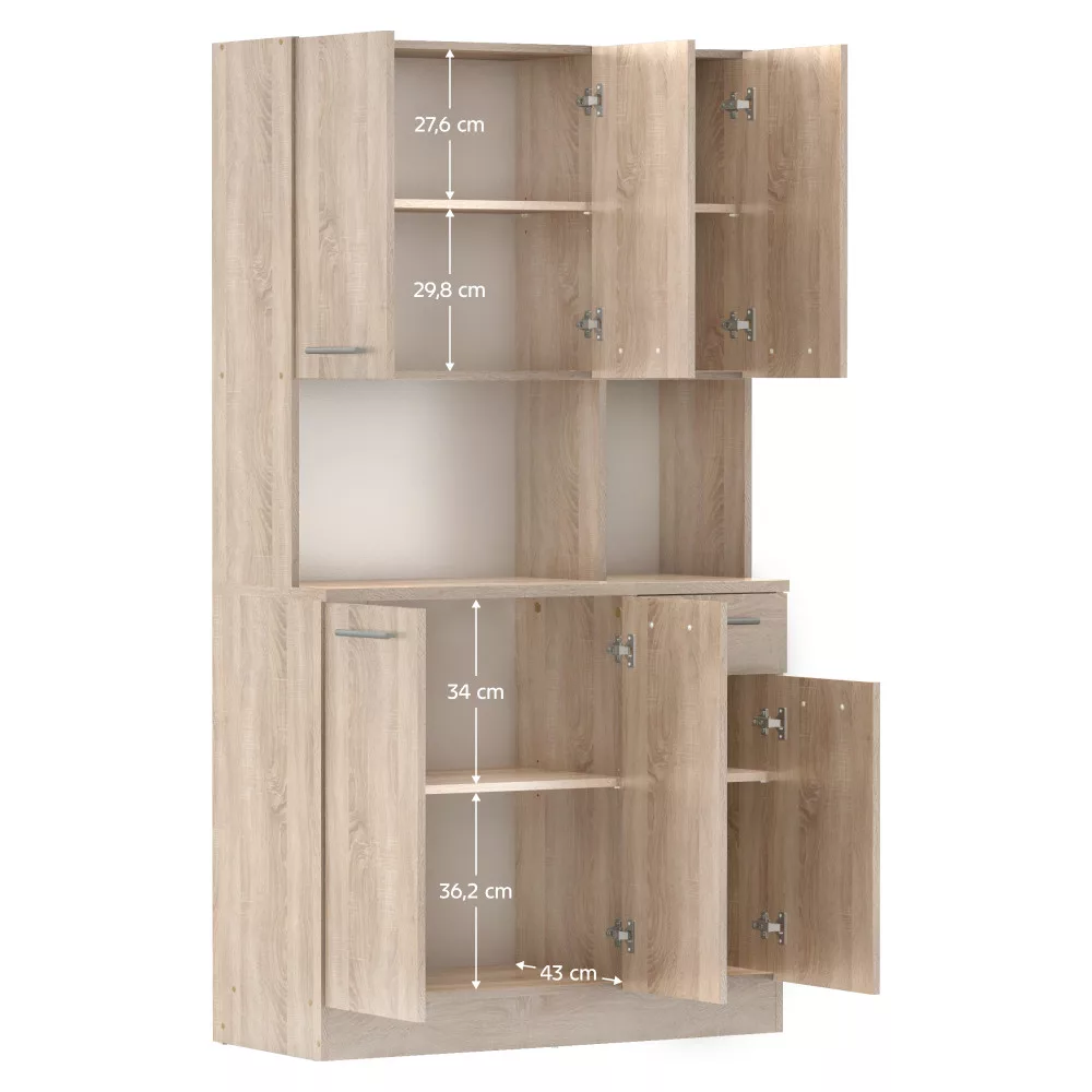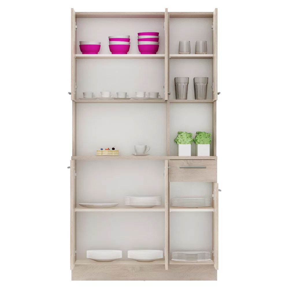 A bőséges tárolóhelyről **hat tágas ajtó** és **egy praktikus fiók** gondoskodik. A belső **polcos** kialakításnak köszönhetően minden konyhai eszköz és étkészlet átláthatóan elrendezhető. A polcok egyenként **5 kg teherbírással** rendelkeznek, a **30,9x15 cm-es** fiók pedig ideális az evőeszközök és egyéb apróságok tárolására. A modern megjelenést az elegáns, **ezüst színű PVC fogantyúk** teszik teljessé, amelyek kényelmes használatot tesznek lehetővé. A padló védelme és az egyenetlen felületeken való stabilitás érdekében a kredenc **műanyag csúszótalpakkal** van ellátva. A maximális biztonság érdekében a bútordarabot **ajánlott a falhoz rögzíteni**.