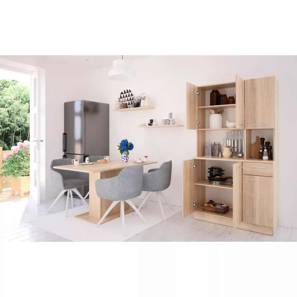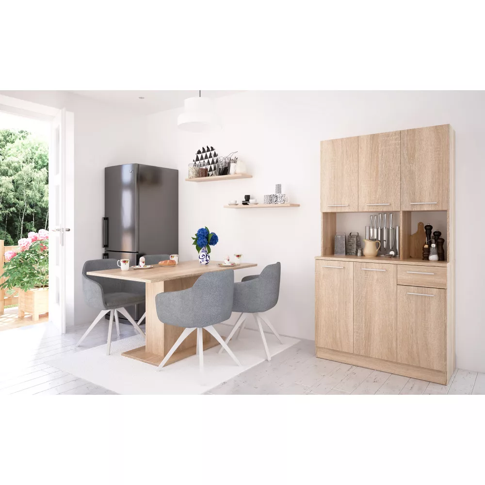 Ezt a **minőségi szlovák terméket** úgy terveztük, hogy nélkülözhetetlen segítőtársad legyen a rendszerezésben, legyen szó a konyháról, az étkezőről vagy akár egy kerti pavilonról. A kredenc tartós, **1,6 cm vastagságú laminált DTD (faforgácslap)** anyagból készült, a természetes hatású **sonoma tölgy** dekor pedig meleg és barátságos légkört teremt. Az alsó szekrény felső lapjának **2,2 cm-es vastagsága** extra stabilitást és teherbírást biztosít, így bátran elhelyezheted rajta a konyhai gépeket vagy dekorációkat.