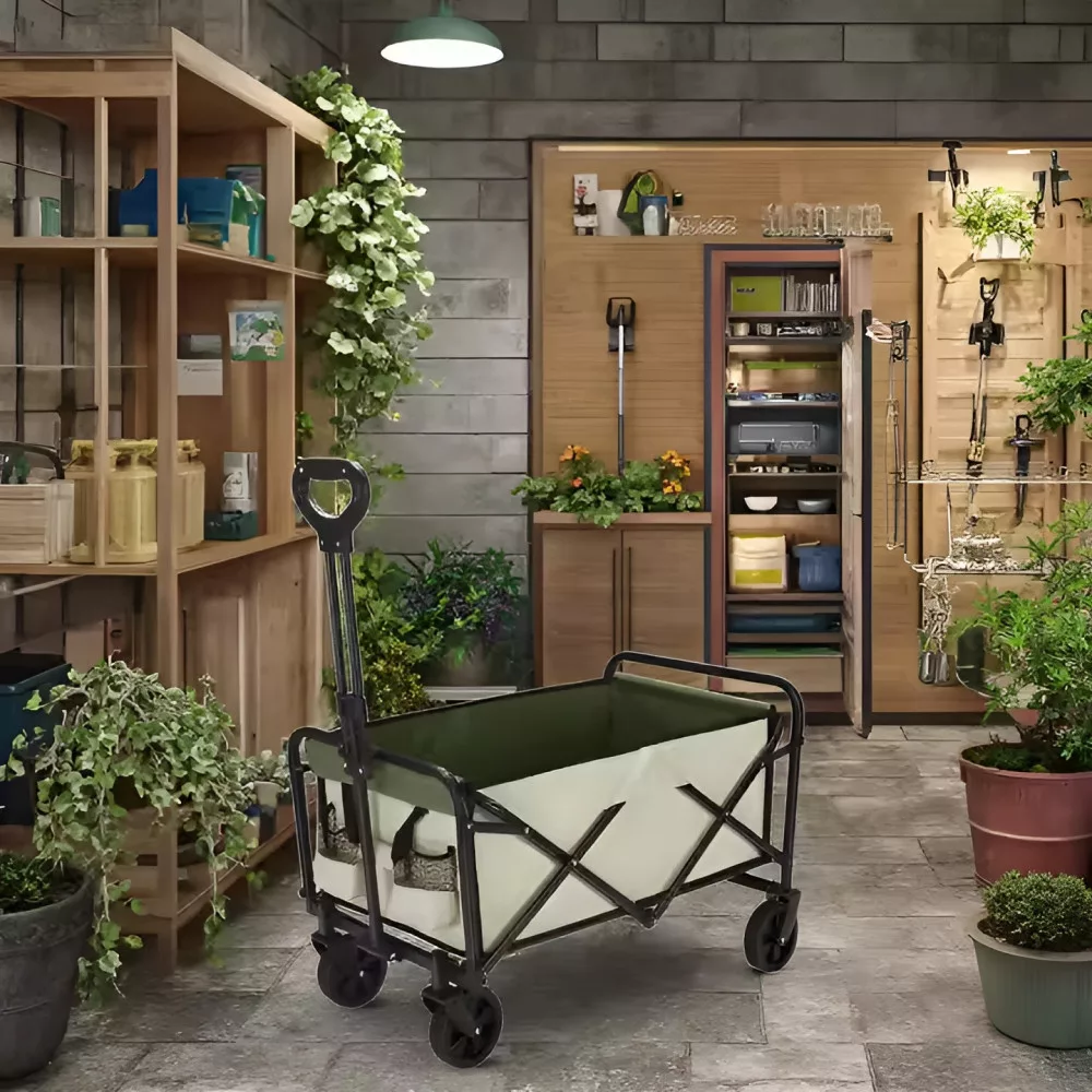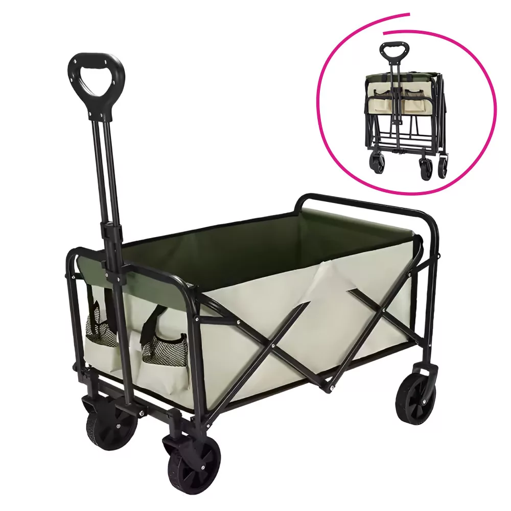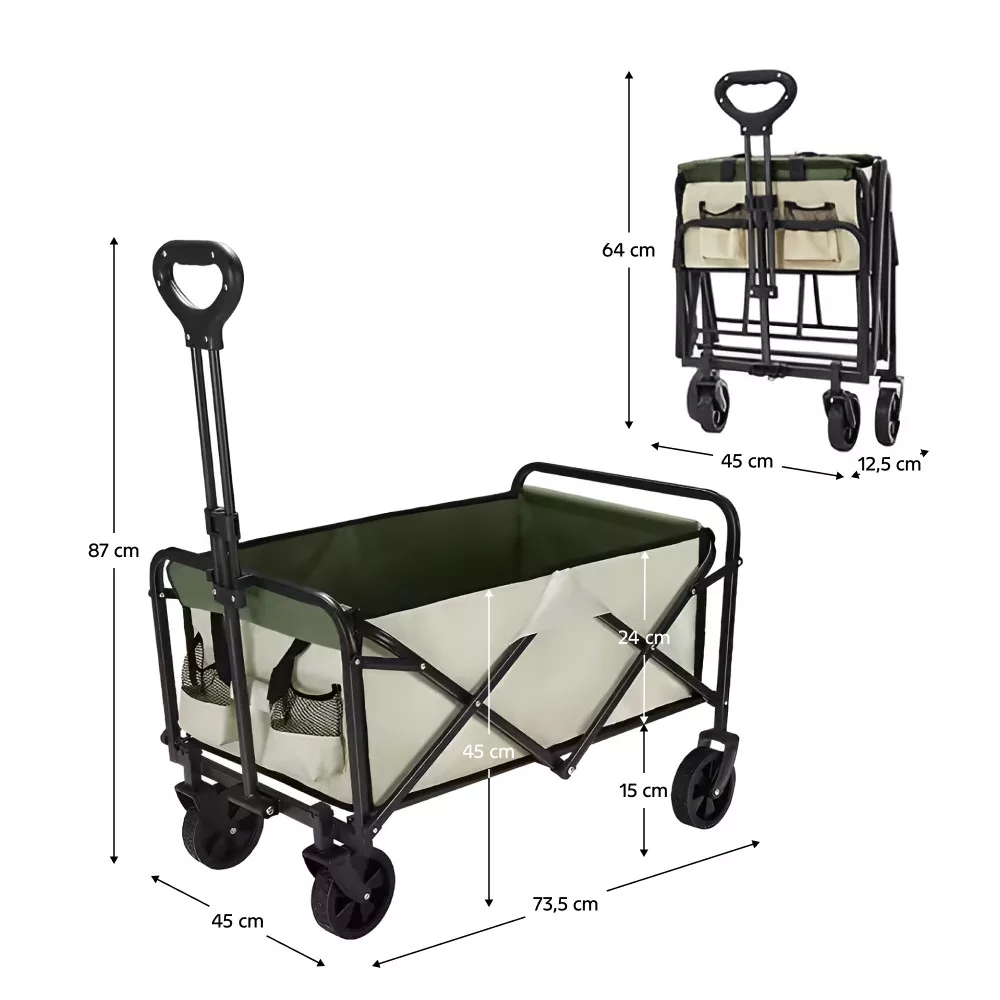 A szabadban töltött idő örömét gyakran beárnyékolja a felszerelések, a nehéz csomagok vagy a kerti szerszámok cipelésének logisztikai kihívása. A KARIL összecsukható kocsi éppen erre a problémára kínál egy átgondolt és professzionális megoldást, amely praktikus segítőtársad lesz a kertben, kempingezés során, családi kirándulásokon vagy bármilyen más szabadtéri tevékenység alkalmával. Masszív, fekete acélvázzal és strapabíró, bézs és zöld Oxford szövettel készült, amelynek köszönhetően még nagy terhelés alatt is stabil és kopásálló marad.