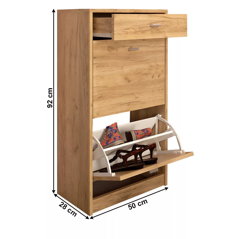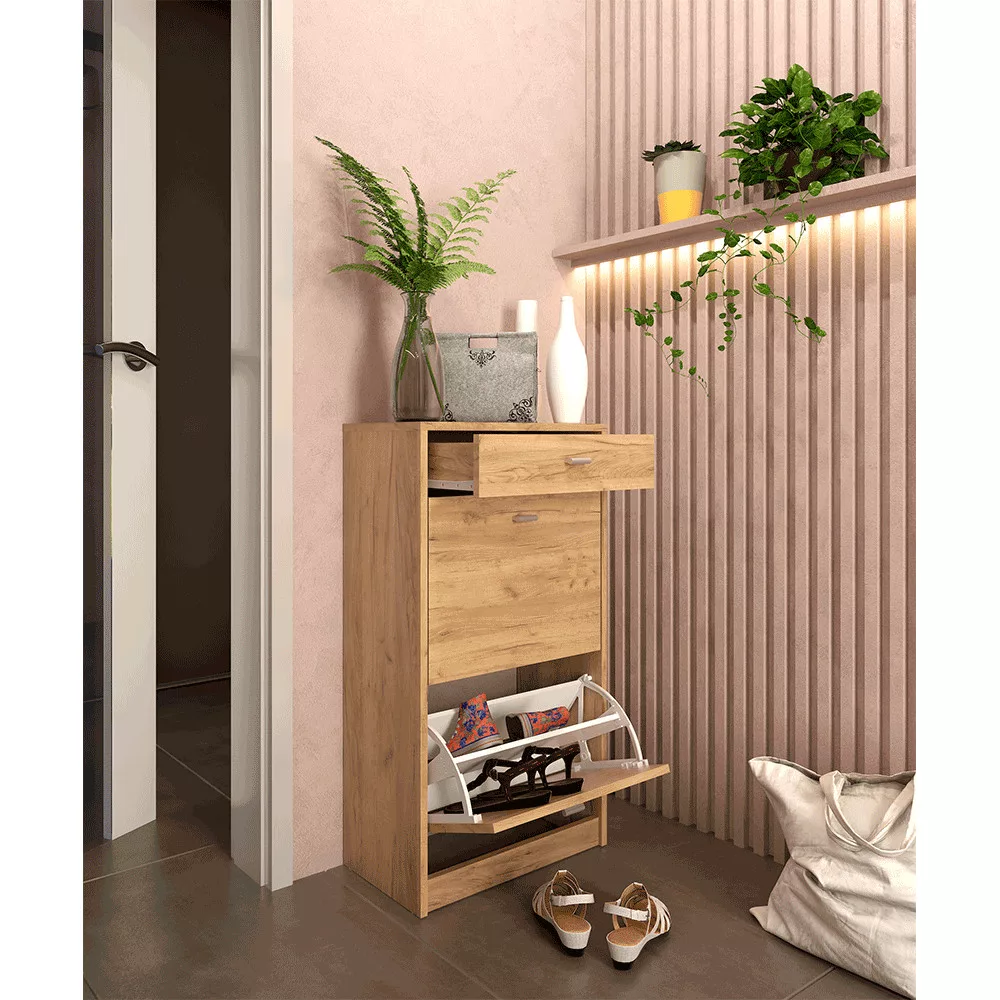 Ismerd meg a VIVAT NEW TYP 1 kétrészes cipősszekrényt, amely a funkcionalitást és a modern dizájnt ötvözi. A minőségi, 16 mm vastagságú laminált DTD faforgácslapból készült bútordarab időtálló artisan tölgy színvilágával melegséget és természetességet visz a térbe. Kompakt méreteinek köszönhetően könnyedén beilleszthető a legtöbb előszobába, miközben okos belső kialakítása meglepően sok tárolóhelyet rejt. A két billenőajtós rakodótér elegánsan elrejti a kisebb és nagyobb cipőket egyaránt, míg a felső, praktikus fiókban tökéletes helyet találsz a kulcsoknak, pénztárcának és egyéb mindennapi apróságoknak.
