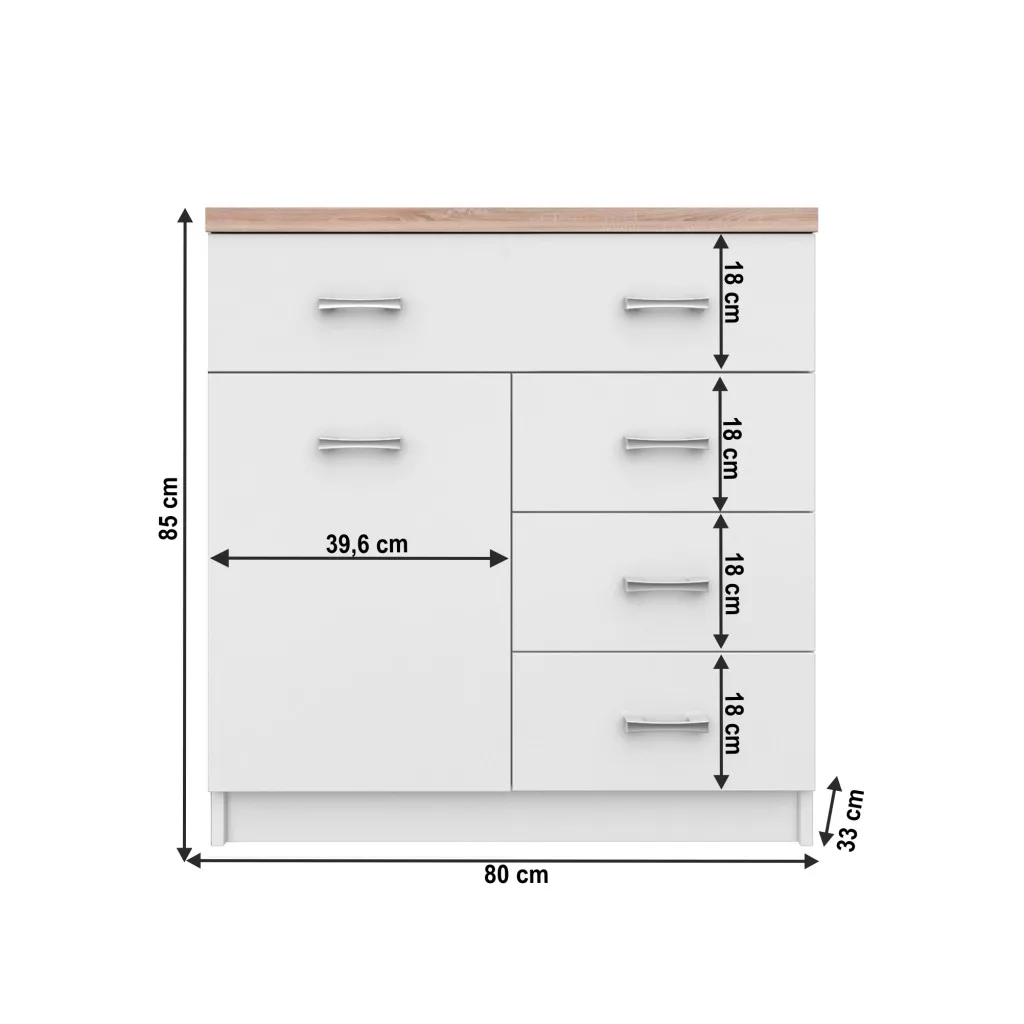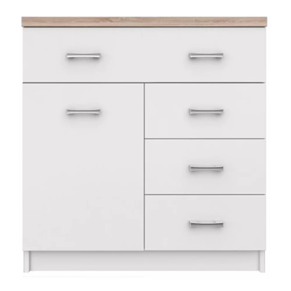 A TOPTY bútorcsalád elemeként ez a komód tökéletesen alkalmas arra, hogy egységes stílust teremtsen otthonod különböző helyiségeiben. Legyen szó a nappali, az étkező, a dolgozószoba vagy akár a gyerekszoba berendezéséről, ez a sokoldalú tároló szekrény mindenhol megállja a helyét. Az egyajtós rész mögötti polc és a négy tágas fiók kombinációja változatos tárolási lehetőségeket kínál. Használhatod elegáns ruhás komódként a hálószobában a hajtogatott ruháknak, de iratok és irodaszerek tárolására is kiváló a dolgozószobában.