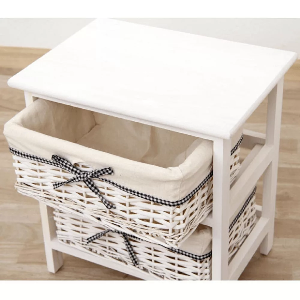 A rendezett és harmonikus otthon megteremtése gyakran a megfelelő tárolási megoldásoknál kezdődik. A Kondela Bútorház által kínált RUBY tároló szekrény egyedi, régies fehér stílusával tökéletes választás lehet számodra. Ez a kompakt bútordarab fa és vessző anyagok ötvözetéből készült, stabil kerete pedig két tágas, fonott kosarat rejt, amelyek ideálisak a kisebb-nagyobb tárgyak átlátható tárolására.