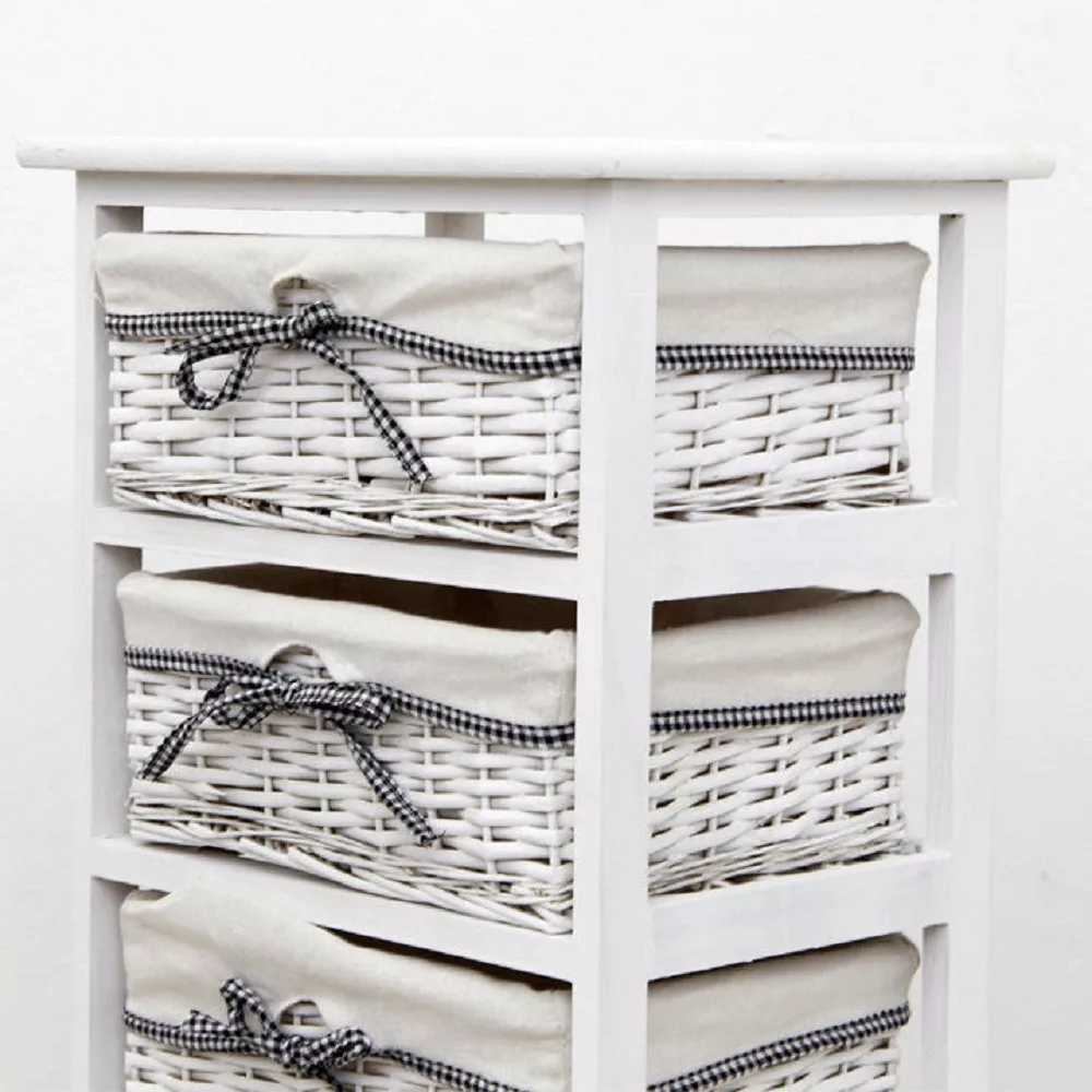 Különleges megjelenésének köszönhetően a RUBY komód szinte bármelyik helyiségben megállja a helyét. Elhelyezheted az előszobában a kulcsoknak és sálaknak, a hálószobában éjjeliszekrényként, de akár a fürdőszobában is remekül funkcionál a kozmetikumok és törölközők rendszerezésére. A régies fehér színvilág finom, romantikus hangulatot kölcsönöz a térnek, miközben a fonott kosarak természetességet és melegséget sugároznak.