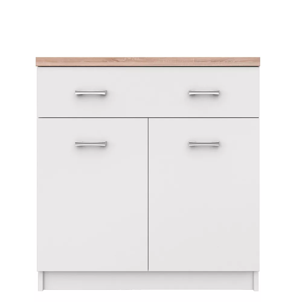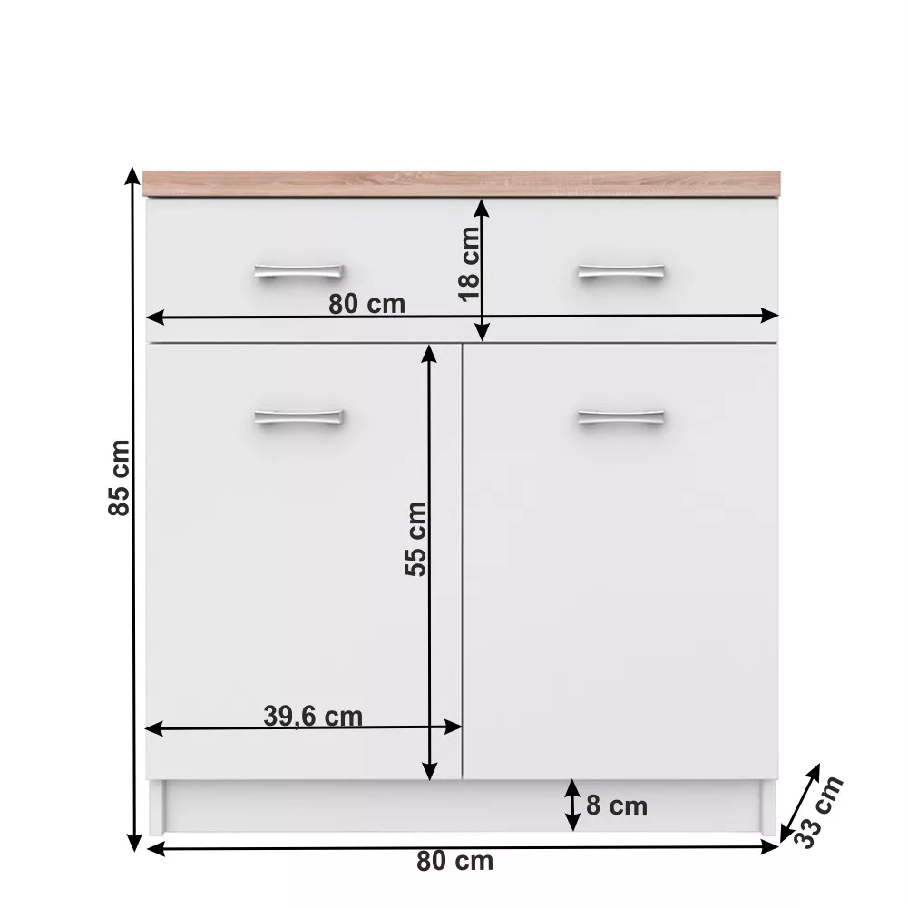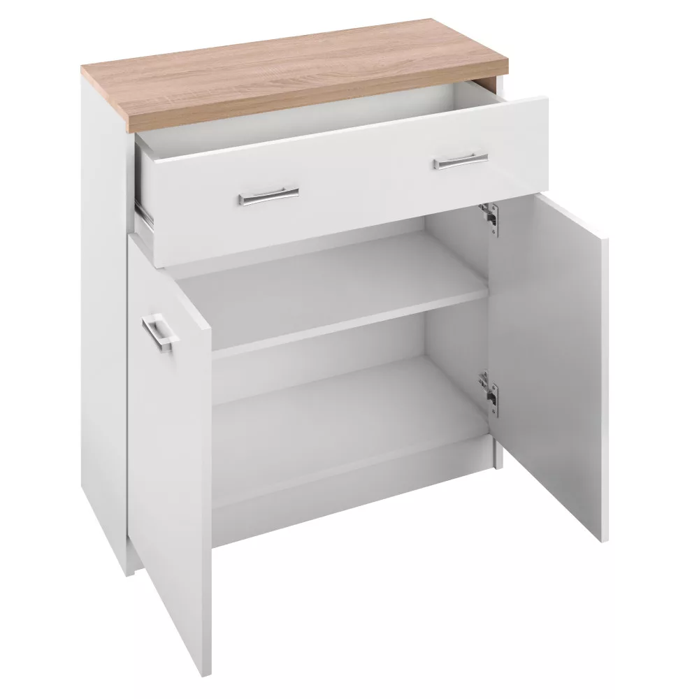 A TOPTY bútorcsalád minden darabja a funkcionalitást és az időtlen dizájnt helyezi előtérbe. Ez a komód laminált DTD (faforgácslap) felhasználásával készült, amely garantálja a tartósságot és a könnyű karbantarthatóságot. A korpusz vastagsága 16 mm, míg a felső lemez robusztus, 32 mm vastagságú, ami stabilitást és prémium megjelenést kölcsönöz neki. A finom eleganciát a diszkrét, krómozott fogantyúk teszik teljessé. Kialakítása rendkívül praktikus: a felső, széles fiók ideális kisebb tárgyak, míg a kétajtós szekrényrész nagyobb holmik, például ruhák tárolására is alkalmas, így kiválóan funkcionál ruhás komódként is.