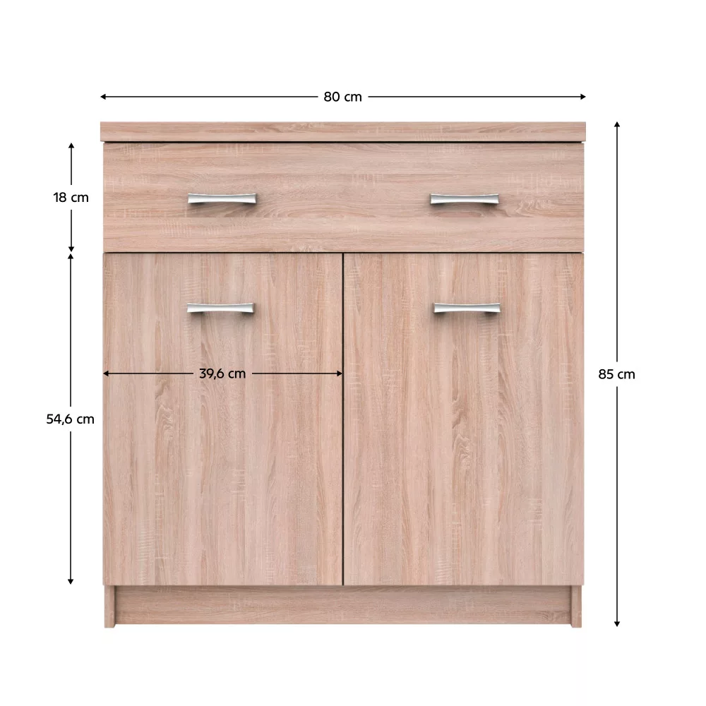Ez a praktikus fiókos szekrény átgondolt belső elrendezéssel rendelkezik, hogy minden holmidnak megtaláld a helyét. A két ajtó mögötti tágas, polcos rész ideális nagyobb tárgyak, textíliák vagy dokumentumok tárolására, míg a felső, széles fiókban a kisebb, de fontos kellékek kaphatnak helyet. A komód felépítése és méretei lehetővé teszik a sokoldalú felhasználást otthonod bármely pontján.