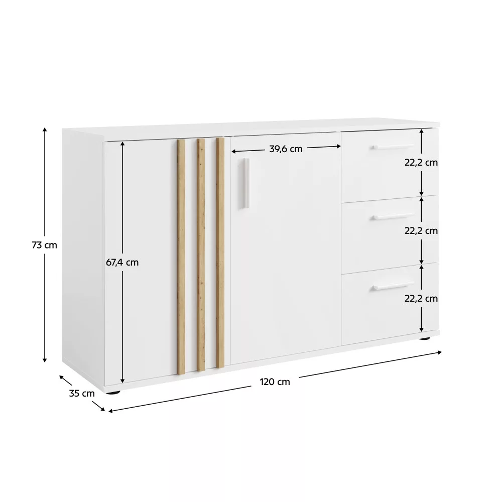 A tervezés során a praktikum is központi szerepet kapott. A kétajtós rész mögött egy polc, mellette pedig három tágas fiók biztosít helyet a legkülönfélébb tárgyaknak, legyen szó ruhákról, kiegészítőkről vagy fontos dokumentumokról. Ennek köszönhetően ez a bútor nem csupán egy esztétikus kiegészítő, hanem egy teljes értékű ruhás komód és fiókos szekrény is egyben. A minimalista, fehér MDF fogantyúk diszkréten simulnak bele a dizájnba, megkönnyítve a használatot. A bútor minőségi, laminált DTD és MDF anyagokból készült, garantálva a tartósságot és a könnyű tisztíthatóságot.