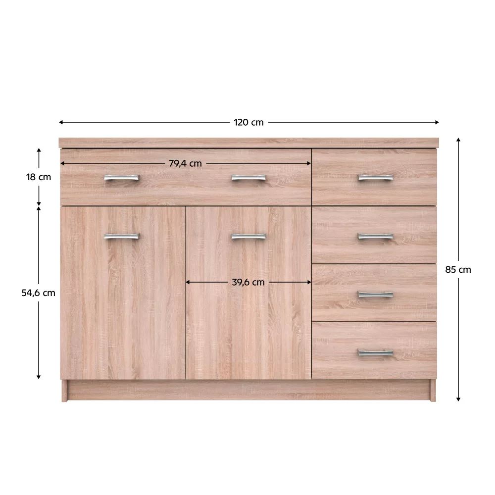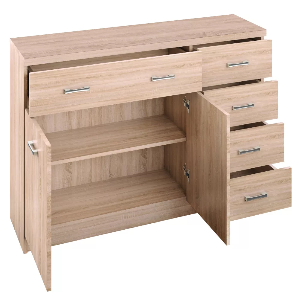 A TOPTY komód egy sokoldalú bútordarab, amely a bútorkollekció részeként lehetővé teszi, hogy otthonod több helyiségében is egységes stílust alakíts ki. Legyen szó nappaliról, hálószobáról, ahol elegáns ruhás komódként funkcionál, vagy akár egy dolgozószobáról, ahol az iratok és irodaszerek kapnak helyet, ez a modell mindenhol megállja a helyét. A gondosan megtervezett belső elrendezés – egy nagyméretű és négy kisebb fiók, valamint egy kétajtós rész – biztosítja, hogy minden holmidnak meglegyen a maga helye. A minőségi laminált DTD anyag garantálja a tartósságot és a könnyű tisztíthatóságot, így hosszú távon is otthonod éke lehet.