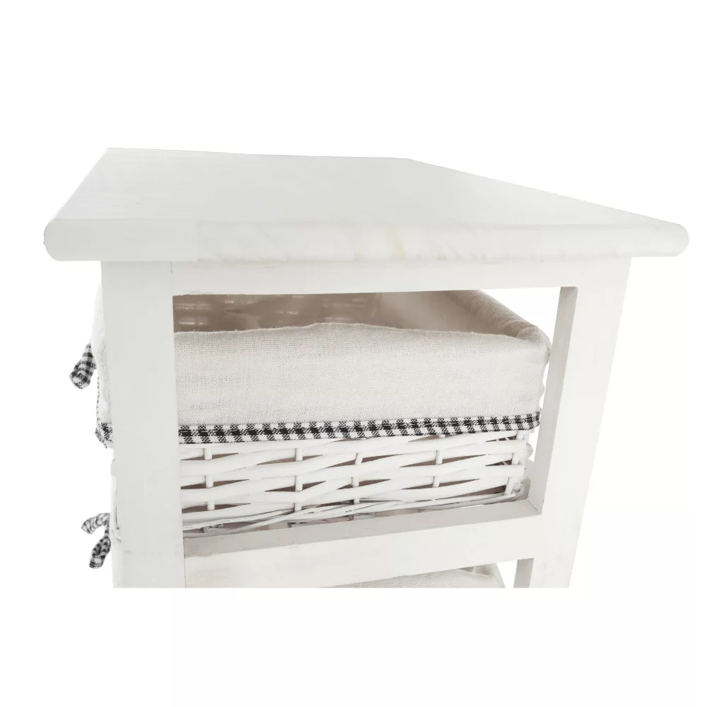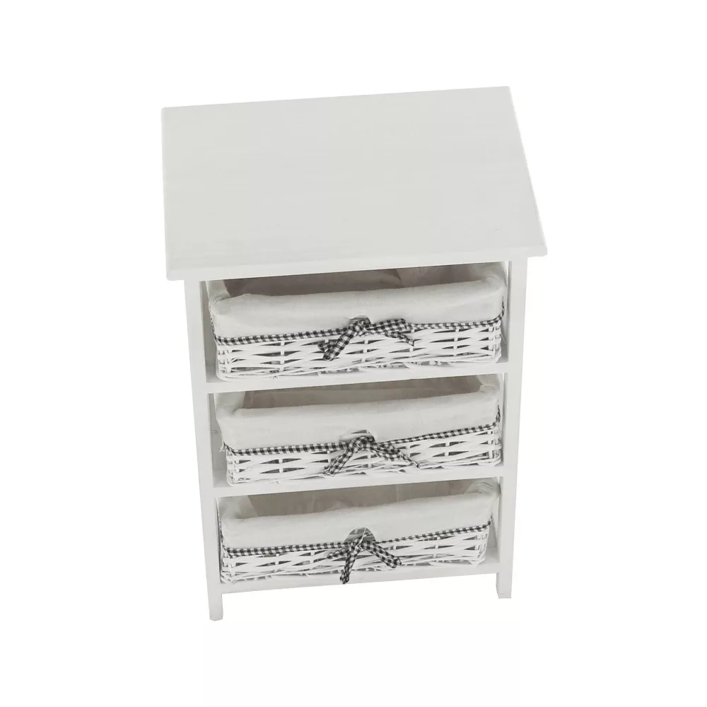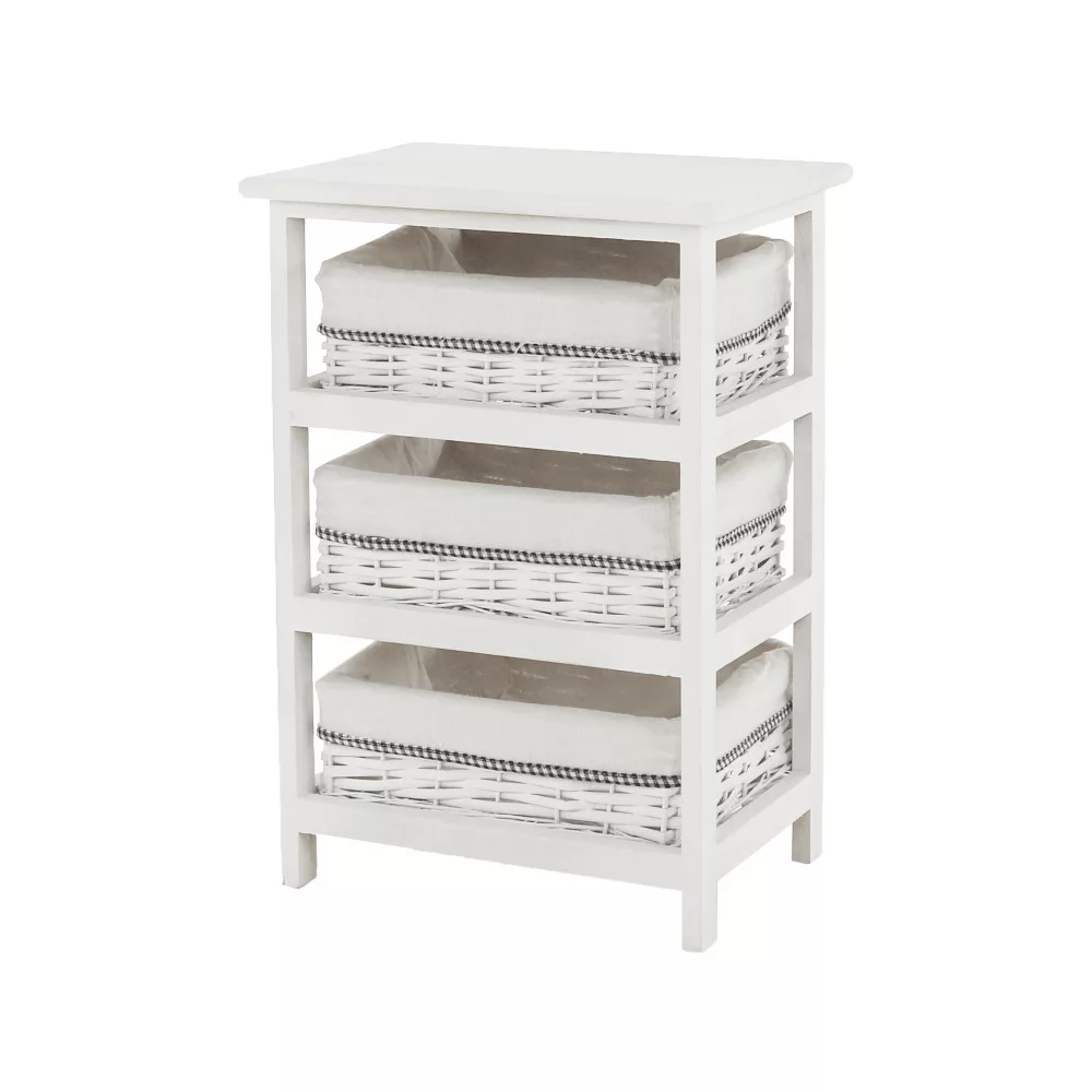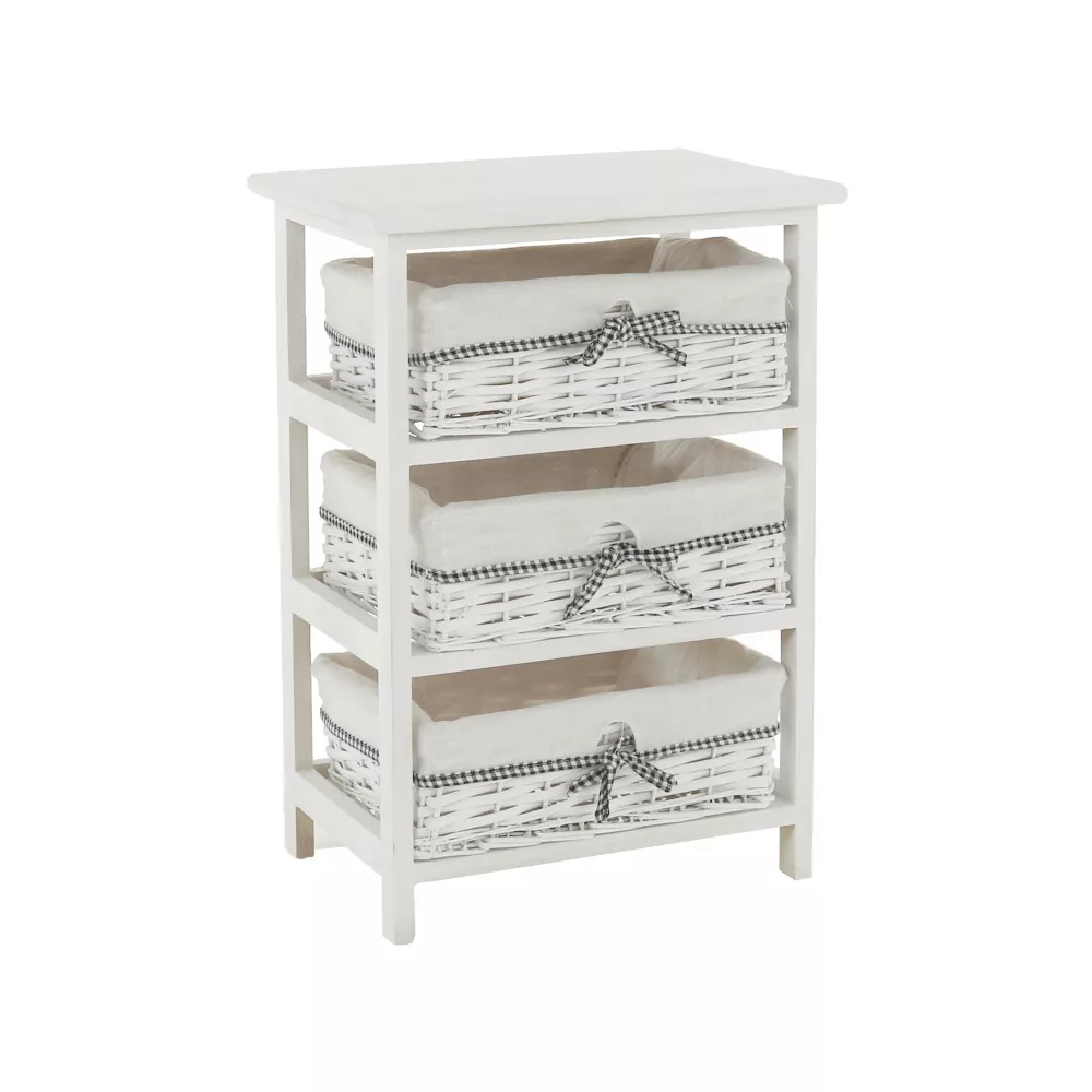 A stabil faszerkezet hosszú távú megbízhatóságot garantál, míg a három tágas, vesszőből font kosár ideális helyet biztosít a különböző tárgyak átlátható rendszerezésére. Kialakításának köszönhetően tökéletes választás az előszobába sálak és kesztyűk tárolására, a fürdőszobába a kozmetikumok és törölközők számára, vagy a hálószobába, ahol akár ruhás komód funkciót is betölthet a kisebb ruhadarabok, kiegészítők számára.