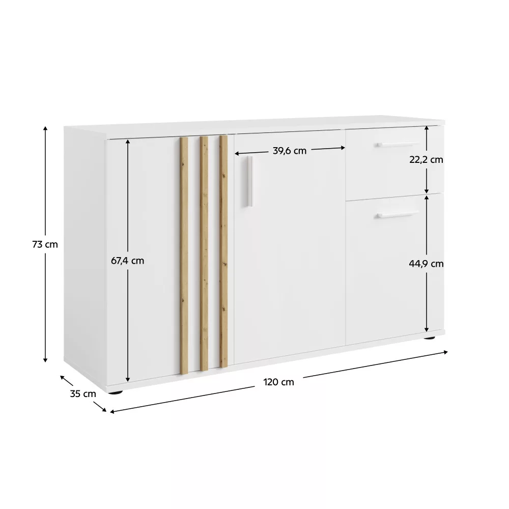 A komód letisztult vonalvezetését a **három ajtón** végigfutó **dekoratív lécek** teszik különlegessé, amelyek egyedi, luxus hatást keltenek. A belső elrendezés tudatosan lett megtervezve: a tágas, **polccal** elválasztott szekrényrészek mellett egy praktikus **fiók** is helyet kapott, amely kiválóan alkalmas kisebb tárgyak, dokumentumok vagy kiegészítők rendezett tárolására. Kompakt méreteinek köszönhetően remek választás kisebb helyiségekbe is, ahol anélkül biztosít bőséges tárolóhelyet, hogy feleslegesen foglalná a teret. Akár a nappaliban, akár a hálószobában, mint elegáns **ruhás komód**, ez a bútor segít rendet tartani, miközben stílust visz a térbe.