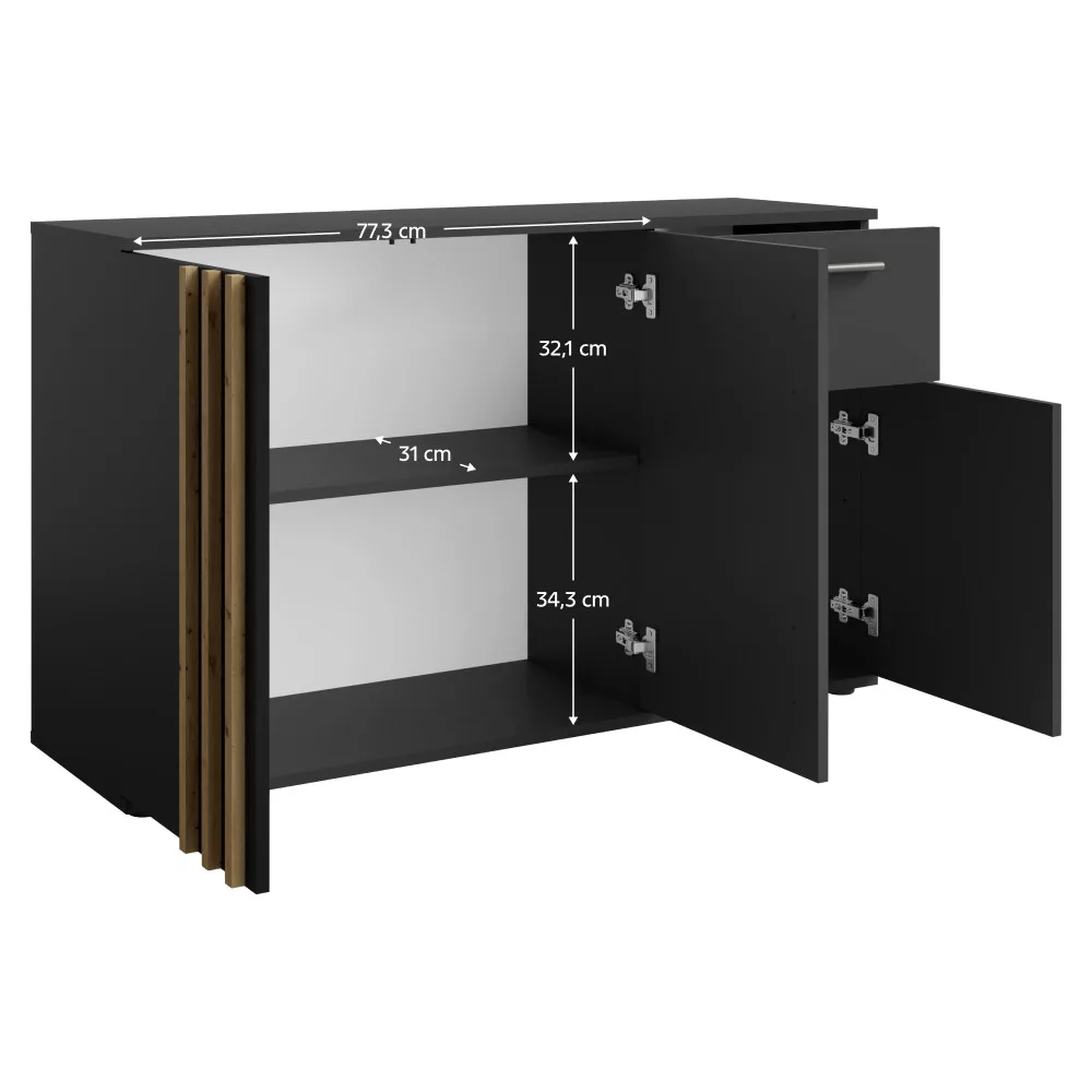 A komód kialakítása tudatosan szolgálja a mindennapi használatot. A három ajtó mögött egy polc található, amely ideális nagyobb tárgyak elhelyezésére, míg a különálló fiók tökéletes helyet biztosít az apróbb, de fontos kiegészítők számára. Ez a felépítés teszi kiváló ruhás komóddá is, ahol a hajtogatott ruhák és a kiegészítők is rendszerezetten elférnek. A letisztult vonalvezetést a fekete, MDF-ből készült fogantyúk egészítik ki, melyek az ajtók egyik oldalán helyezkednek el, hozzájárulva a minimalista, mégis karakteres összképhez.