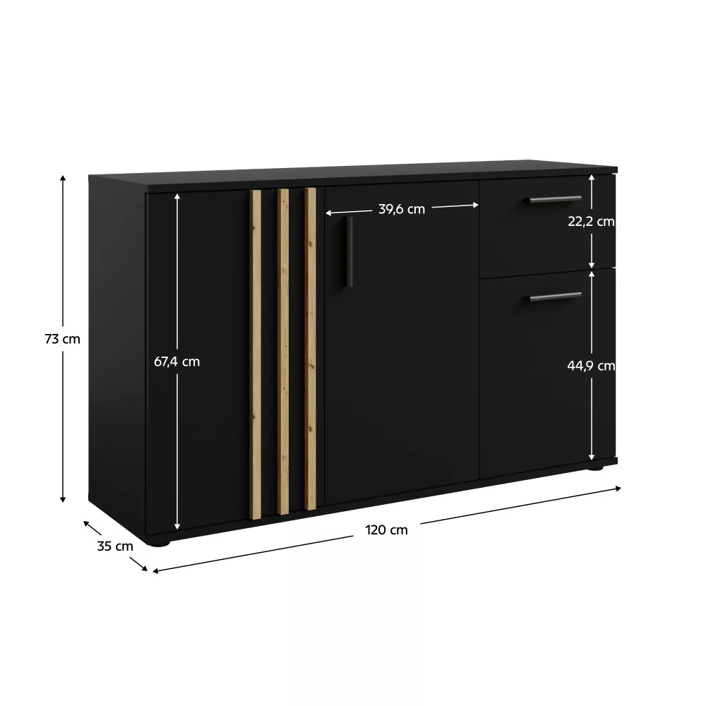 Az TOLIS TYP 2 komód pontosan ezt a kettősséget kínálja: egy modern dizájnú, praktikus és elegáns megoldás, amely a fekete és artisan tölgy színkombinációjával kifinomultságot sugároz. A dekoratív lécekkel díszített ajtók egyedi, luxus megjelenést kölcsönöznek neki, így ez a tároló szekrény nem csupán funkcionális, hanem a tér központi díszévé is válik. Kifejezetten ideális választás kisebb helyiségekbe, ahol minden centiméter számít, hiszen praktikus tárolási lehetőséget nyújt anélkül, hogy feleslegesen foglalná a teret.