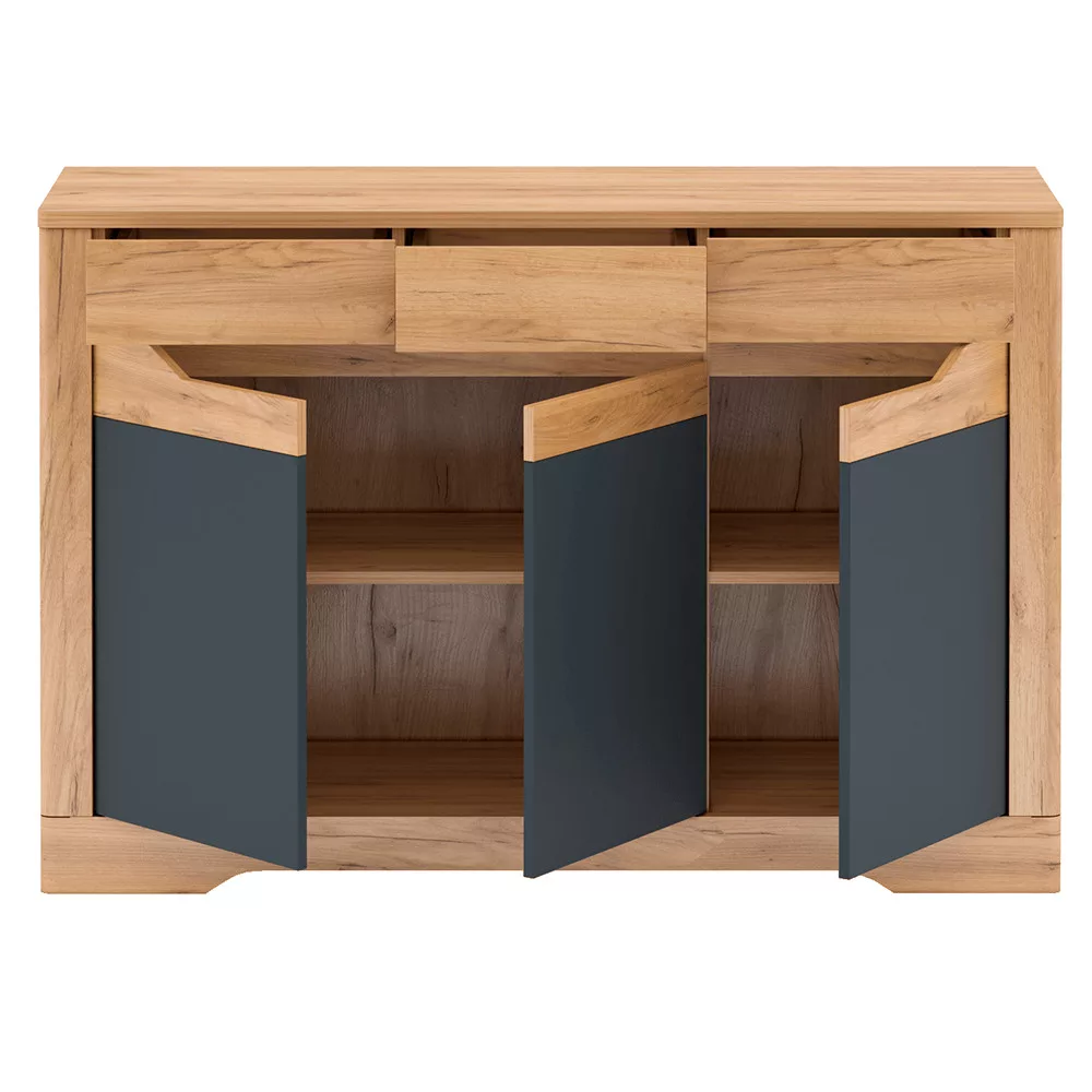 A FIDEL komód tervezésekor a funkcionalitás és az esztétikum tökéletes egyensúlyára törekedtünk. A három tágas fiók és a két, polcokkal elválasztott szekrényrész bőséges helyet kínál ruháinak, személyes tárgyainak vagy akár a nappaliban használt eszközöknek. Sokoldalúságának köszönhetően ideális választás lehet ruhás komódként a hálószobában, vagy praktikus tároló szekrényként a nappaliban. A vastagabb, 22 mm-es munkalap stabil felületet biztosít dísztárgyak, lámpák vagy könyvek elhelyezésére, így téve még otthonosabbá a teret.