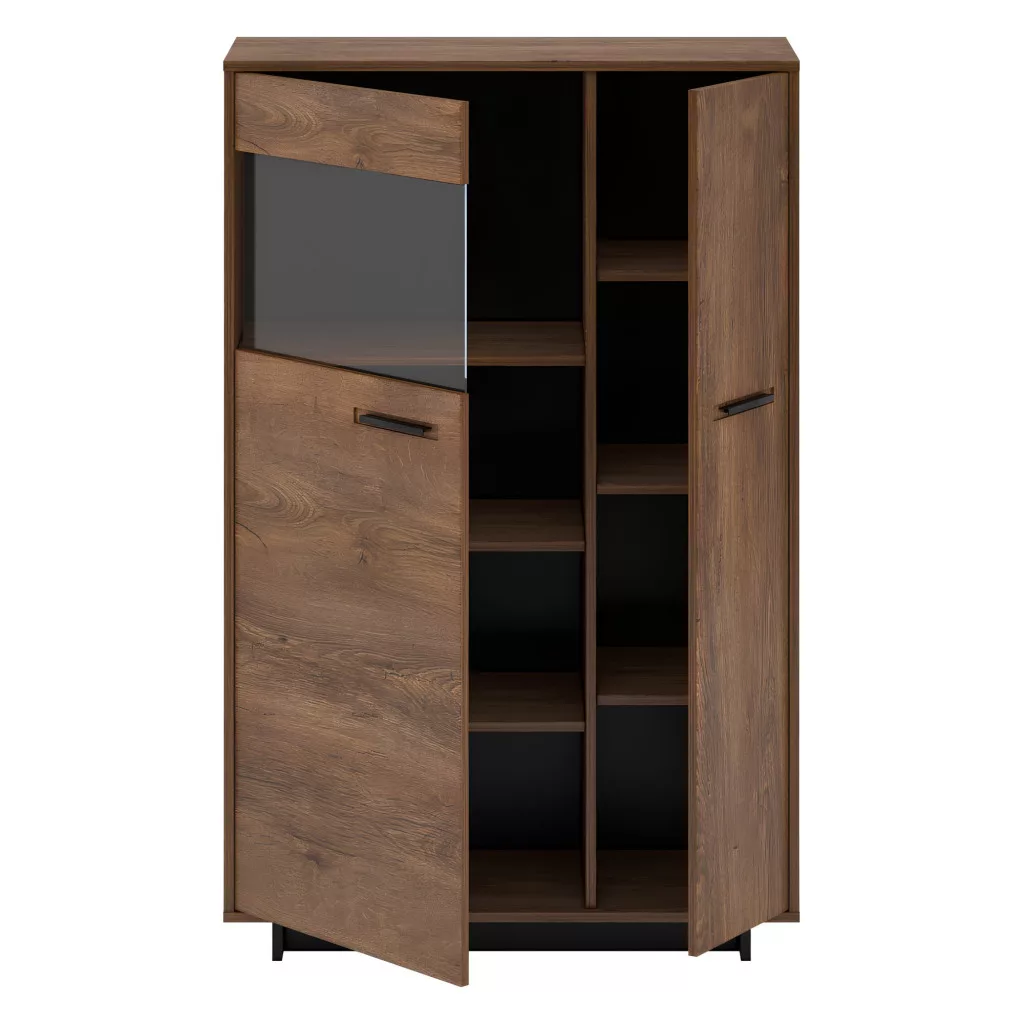 Ez a különleges kiállító szekrény nem csupán tárolóeszköz, hanem otthonod központi díszeleme is lehet. A gyönyörű, egyedi fa rajzolat természetességet sugároz, míg a robusztus fém fogantyúk és a fekete talapzat modern, indusztriális jelleget kölcsönöznek neki. Az üveggel kombinált ajtók mögött elegánsan mutathatod be legszebb dísztárgyaidat, így tökéletes választás lehet pohárszékként vagy porcelán szekrényként is. A belső elrendezés a hat darab, strapabíró DTD polccal bőséges és jól szervezett tárolóhelyet biztosít.